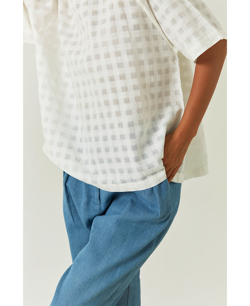 A self checkered top featuring a round neck, raglan sleeve and keyhole opening at the back. The model is 5'5", and is wearing size S-M.