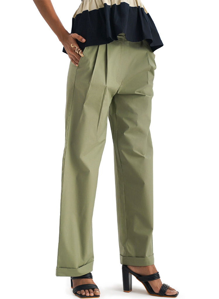 A pair of roll-up pants with pleats featuring a fitted waist with a zipper and inseam pockets. Length 40". The model is 5'8" and is wearing a size S.