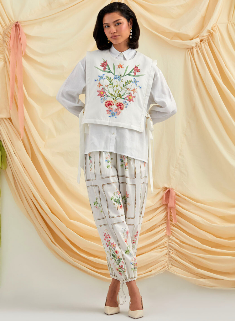 A three-piece set pairing the Lily Shirt, the Bouquet Bib and the Bouquet Pants. The classic crisp white shirt features lace insertions at the cuffs. The sleeveless bib top with botanical prints, delicate hand-embroidery and lace details on the back features soft tie-up sides. Length 19". The relaxed-fitting trousers with framed floral motifs feature an elastic waistband and drawstring hems. The model is 5'8" and is wearing size S.