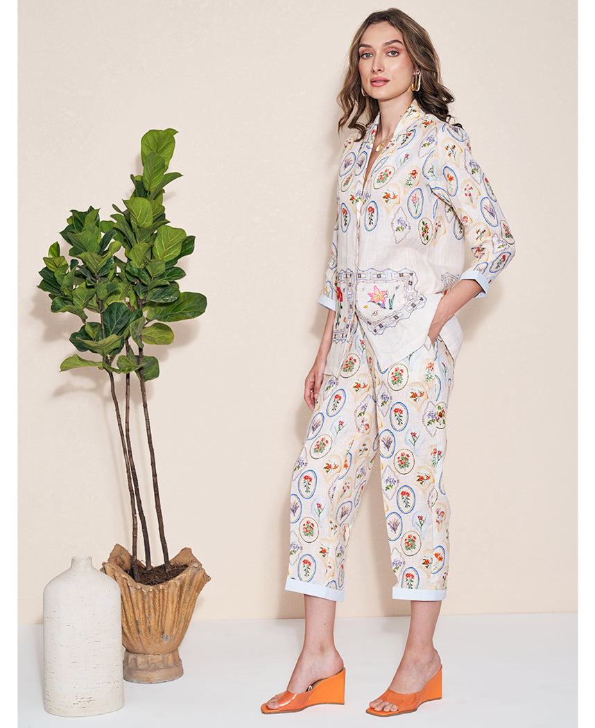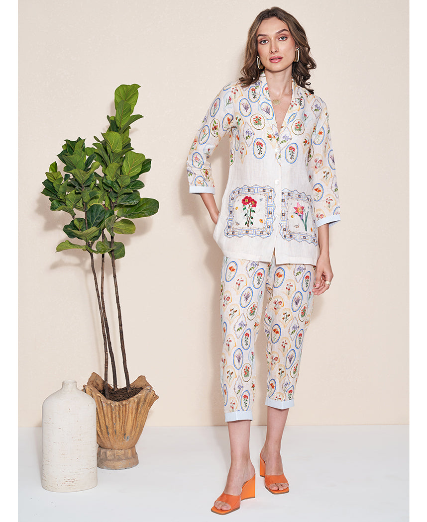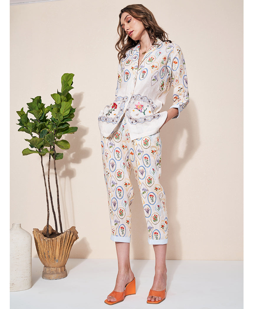 A pair of straight, slim-fit crop trousers with floral print, half elasticated waist belt, and side pockets featuring side closure and contrasting folded hem. Length 35". The model is 5'8" and is wearing size XS.