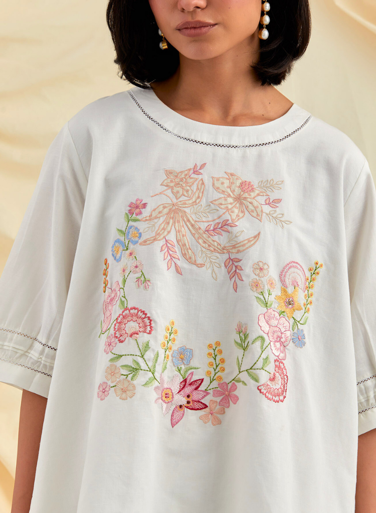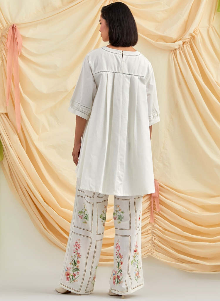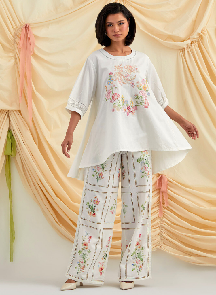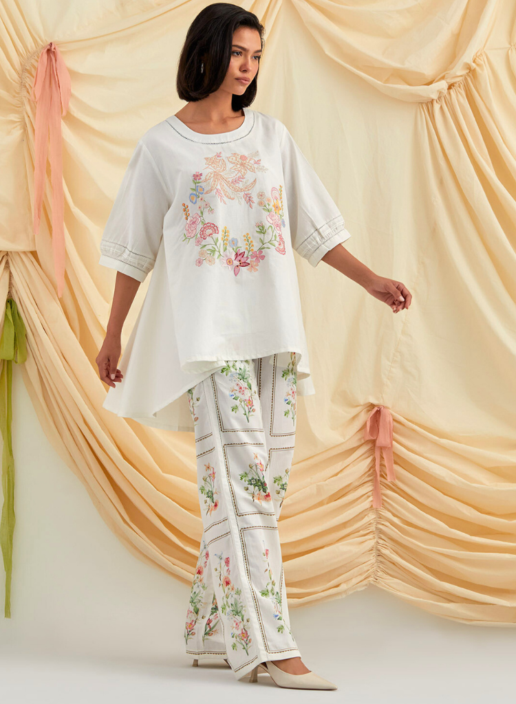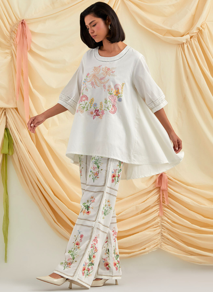 A two-piece set pairing a flared top and wide leg trousers. The flared top with an asymmetric hemline accentated by colourful & delicate floral embroidery on the front features a round neck. The floral wide leg trousers with lace inserts feature a fitted waist and inseam pockets. The model is 5'8" and is wearing size S.