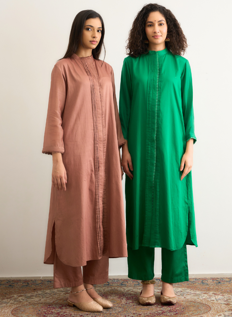 A two-piece set pairing the Gloria Kurta and matching pants. The relaxed fitting kurta with pintuck and lace details features a band collar, 3/4th sleeves and a curved hem with side slits. Length 49". The matching straight fit pants feature an elasticated waist and inseam pockets. Length 37". Made in vegan silk.