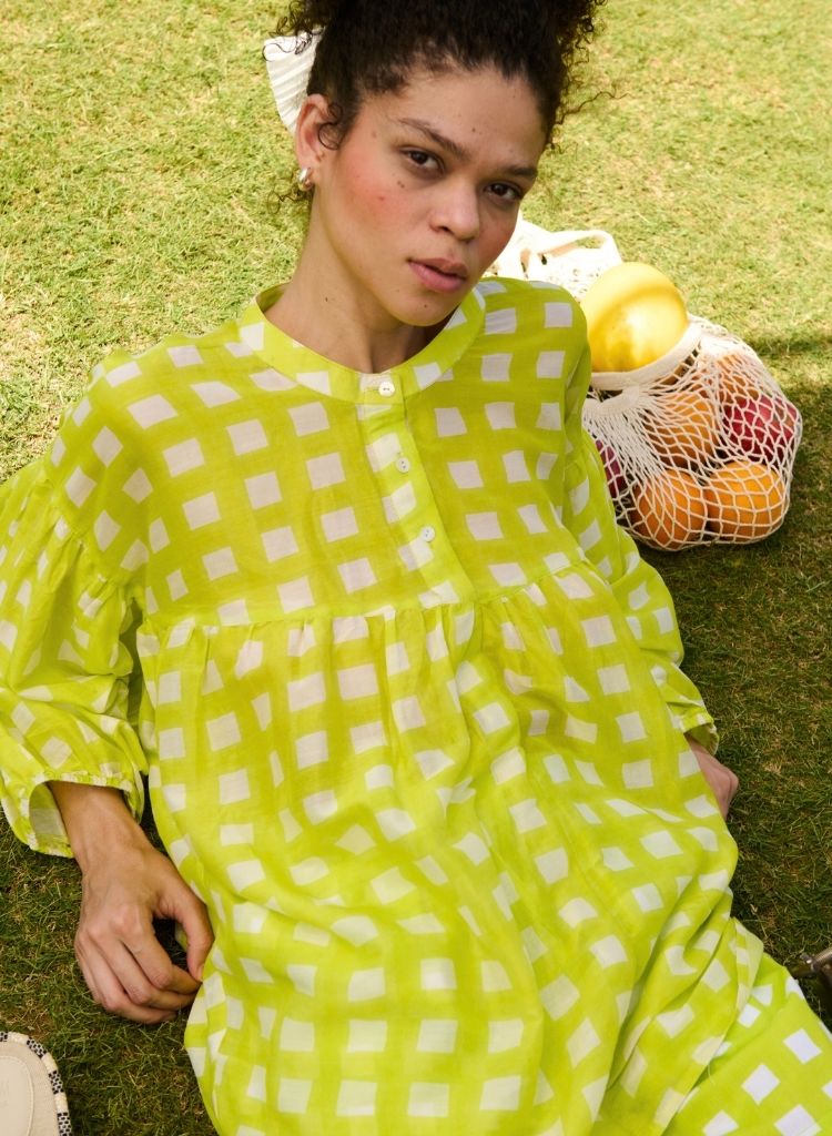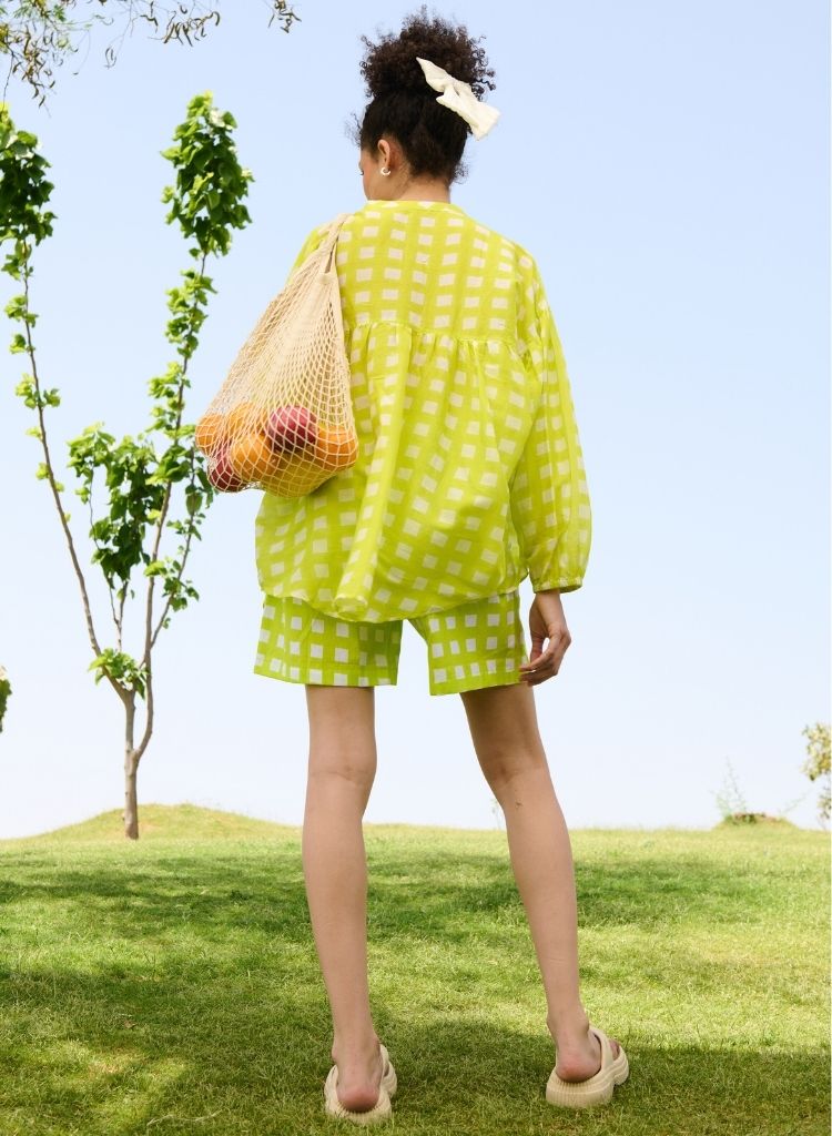 A two-piece set pairing a checkered top and matching pants. The checkered top with elasticated sleeves features a band collar and a half button placket. Length 29". Made in cotton silk. The matching shorts feature an elasticated waist and inseam pockets. Length 17". Made in linen cotton.