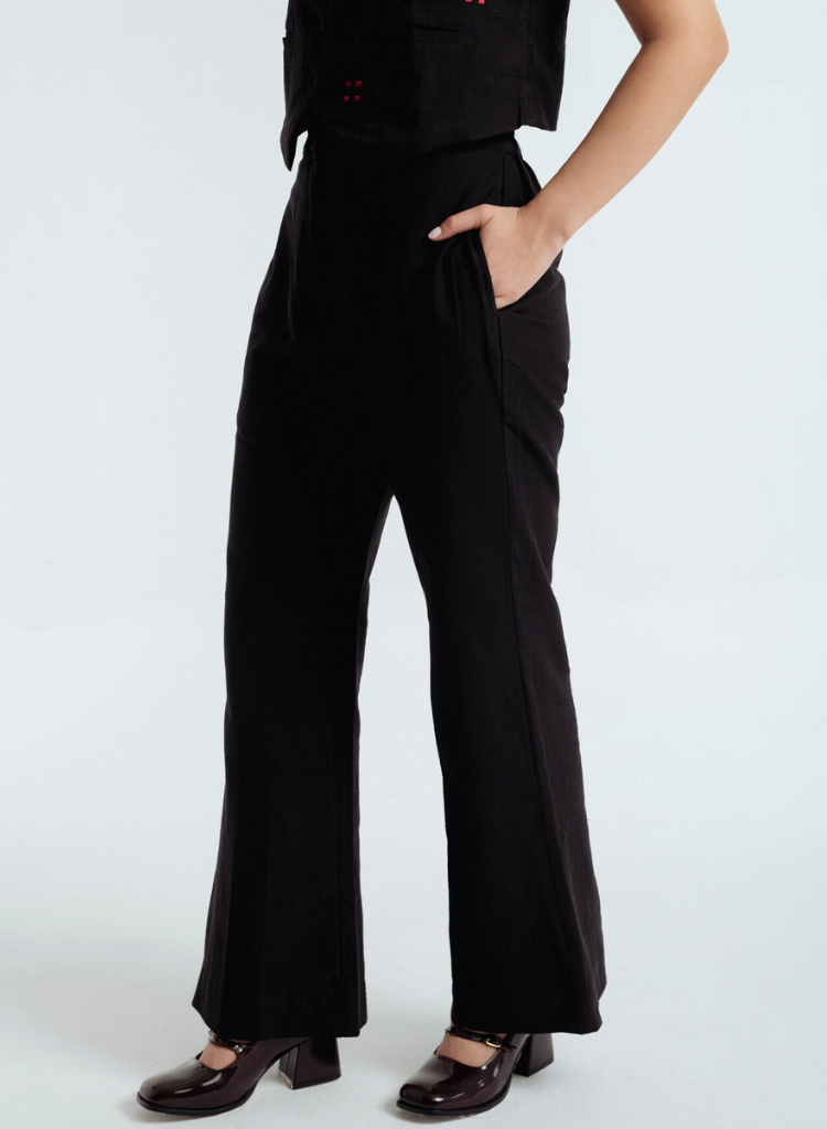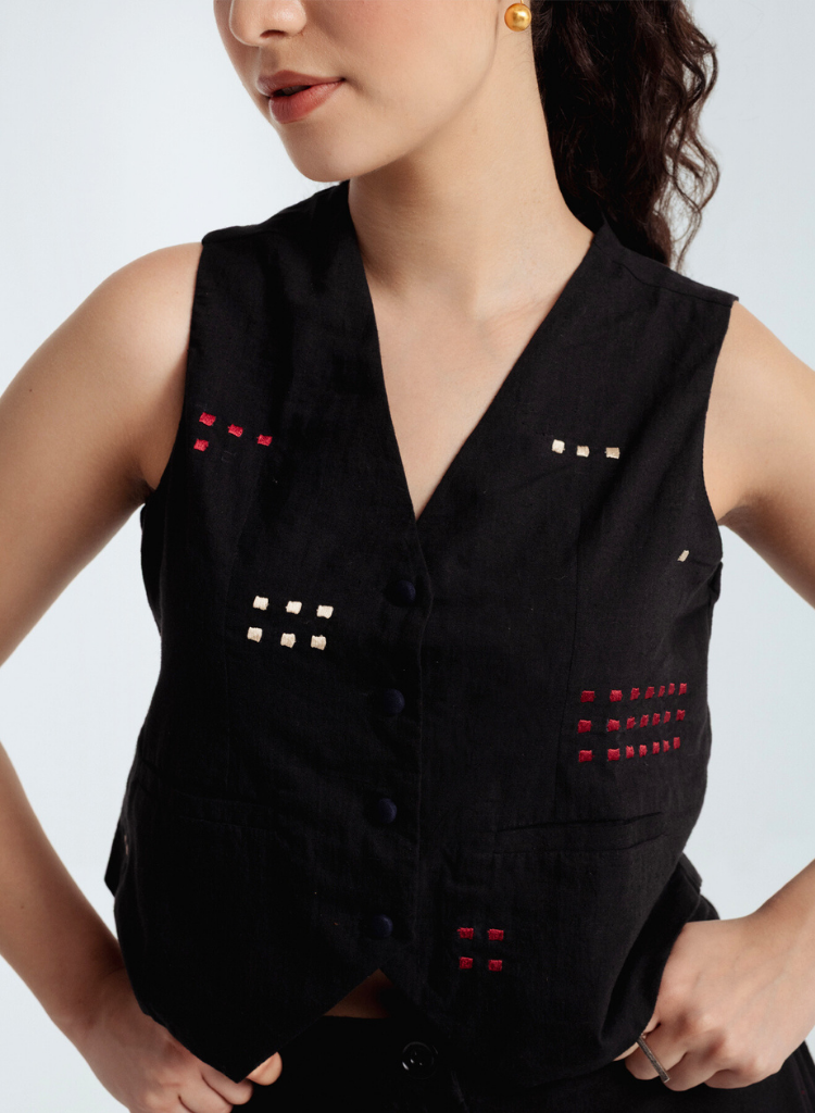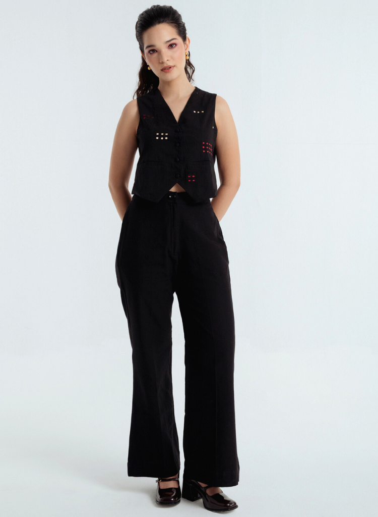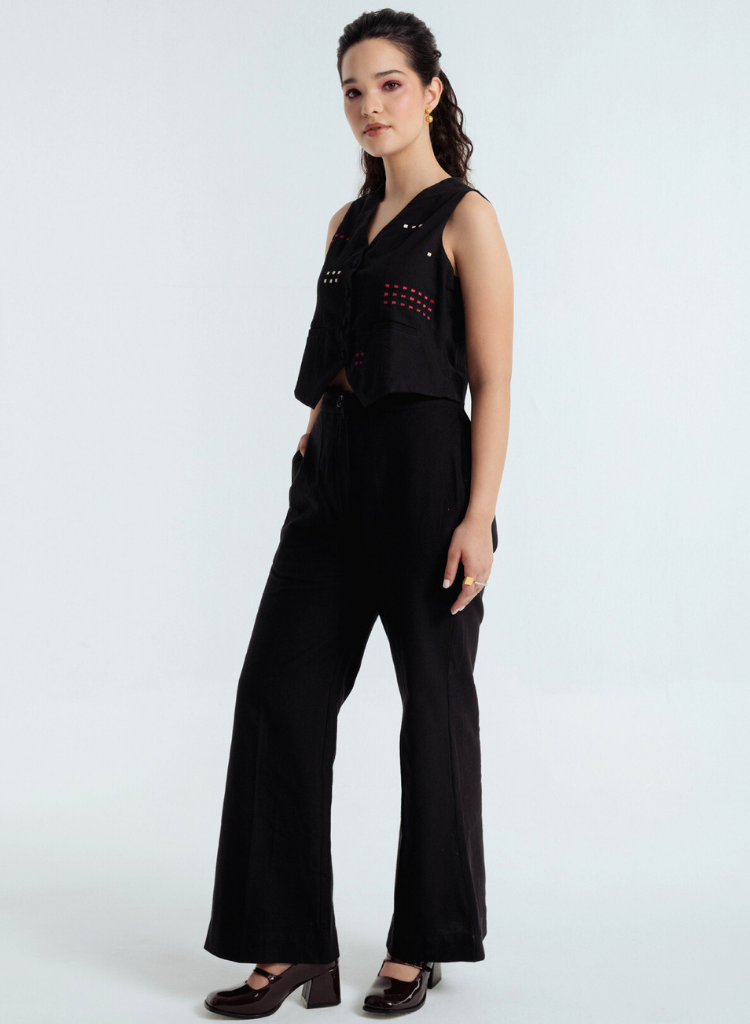 A two-piece set featuring the Fayra Waistcoat and the Fayra Pants. The sleeveless waistcoat with delicate embroidery in contrasting red and beige features a V-neck and button detailing in the front. Length 17", lined. The pant features a front zipper, side pockets and an elasticated waist. Length 40". The model is 5'7" and wears a size S.