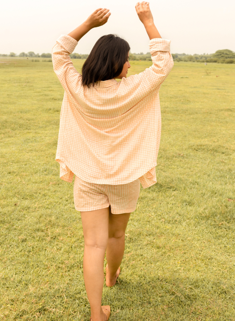 An oversized checkered shirt featuring drop shoulders and mother of pearl buttons. The model is 5'4" and is wearing a size S.