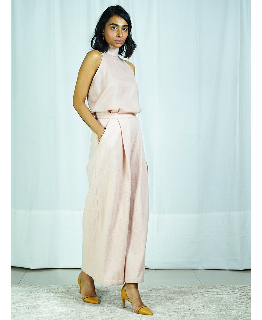 A two-piece set pairing the Stand Collar Top and Pleated Felt Pants. The sleeveless top features a halter style fit and loop buttons at the back. Length 21". Made in wool. The wide leg pants have a pleated front, side pockets and a concealed side zipper. Length 38". Made in wool with crepe lining.
