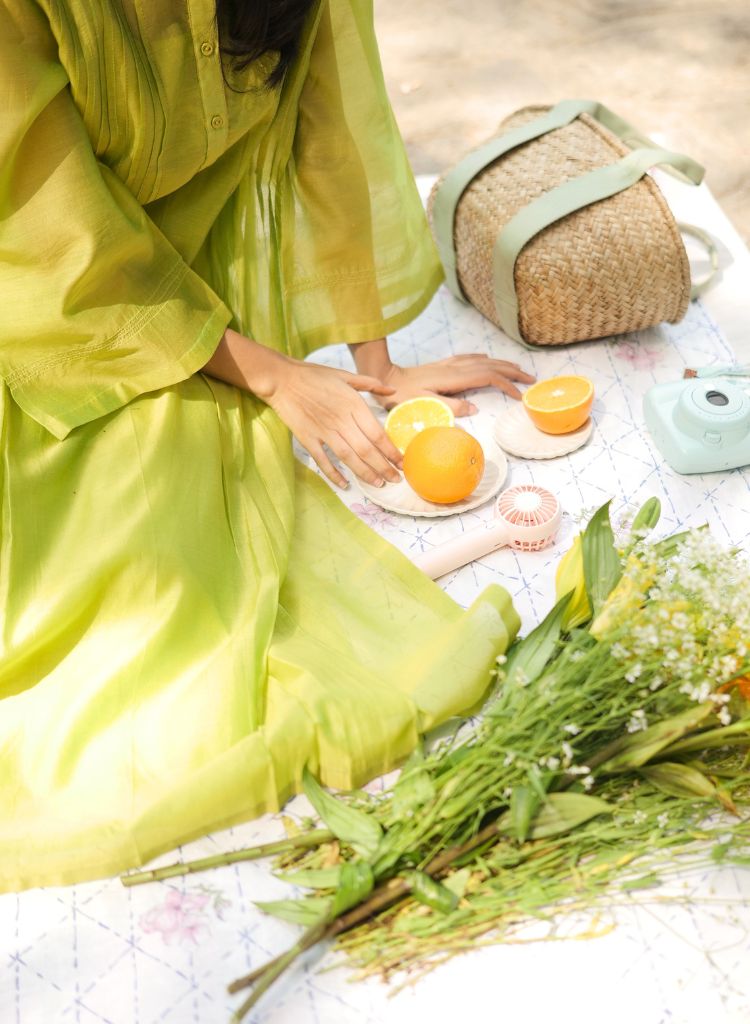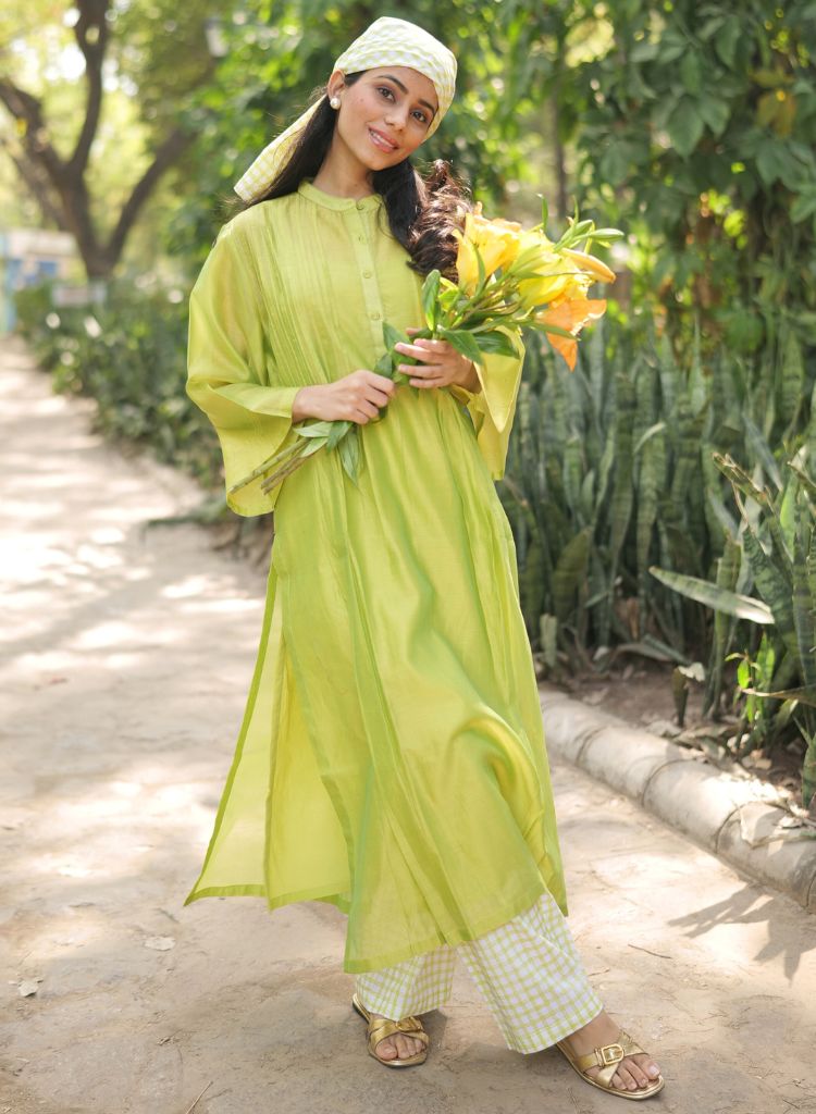 A two piece set pairing the Whisper Of Elegance Kurta and Whisper Of Elegance Pants. The A-line kurta with pintuck and zari details features a round neck, a half button placket, wide sleeves and side slits. Length 47”. Made in Chanderi silk, comes with a slip. The handblock printed checkered pants feature a fitted waist and inseam pockets. Length 40”. Made in 100% cotton.