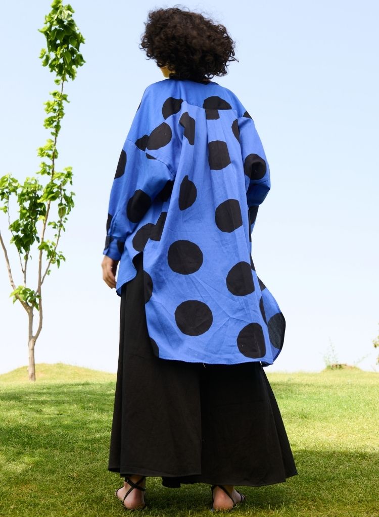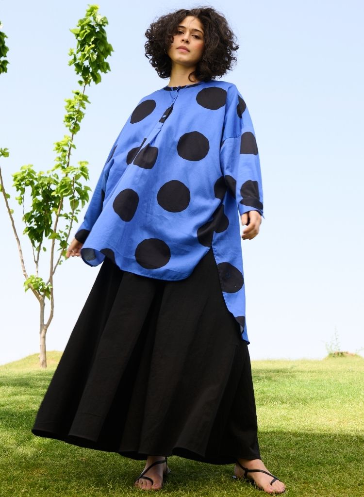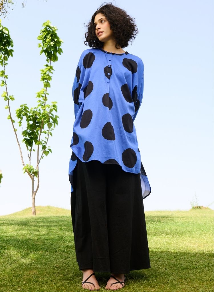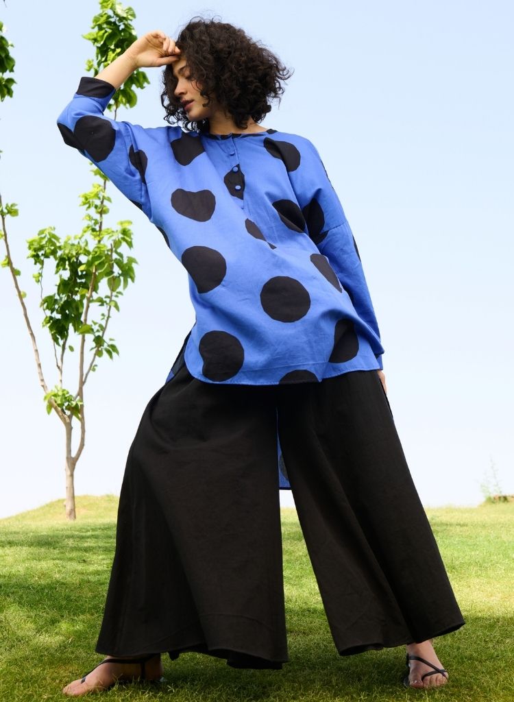A two piece set pairing a polka tunic and flared trousers. The polka tunic with a high low hem features a round neck and a half button placket. Length 34". The flared pants feature an elasticated waist and inseam pockets. Length 40". The model is 5'11" and is wearing a size M.