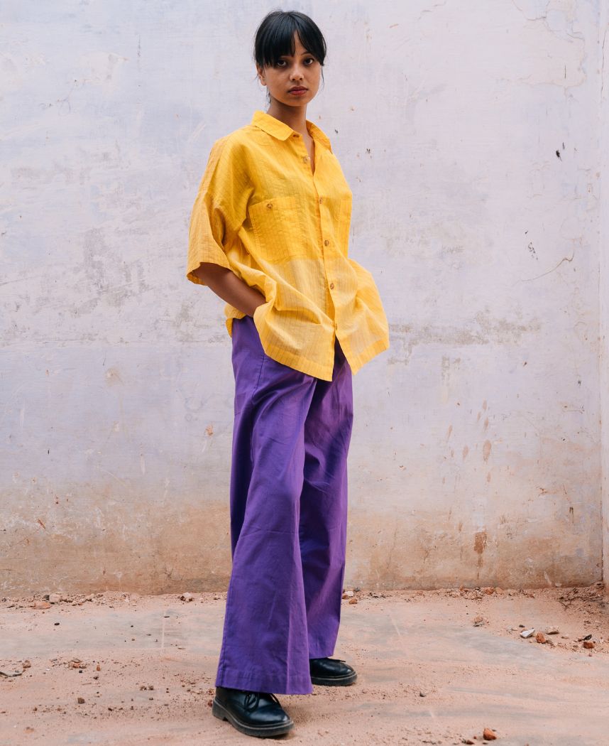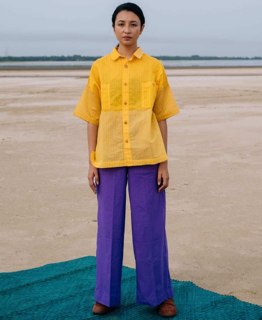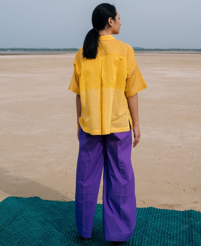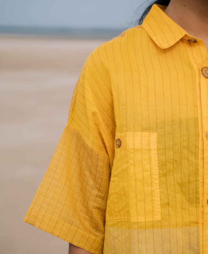 A striped boxy shirt featuring a classic collar, a front button placket and side slits. Length 26". The model is 5'6" and is wearing a size S.