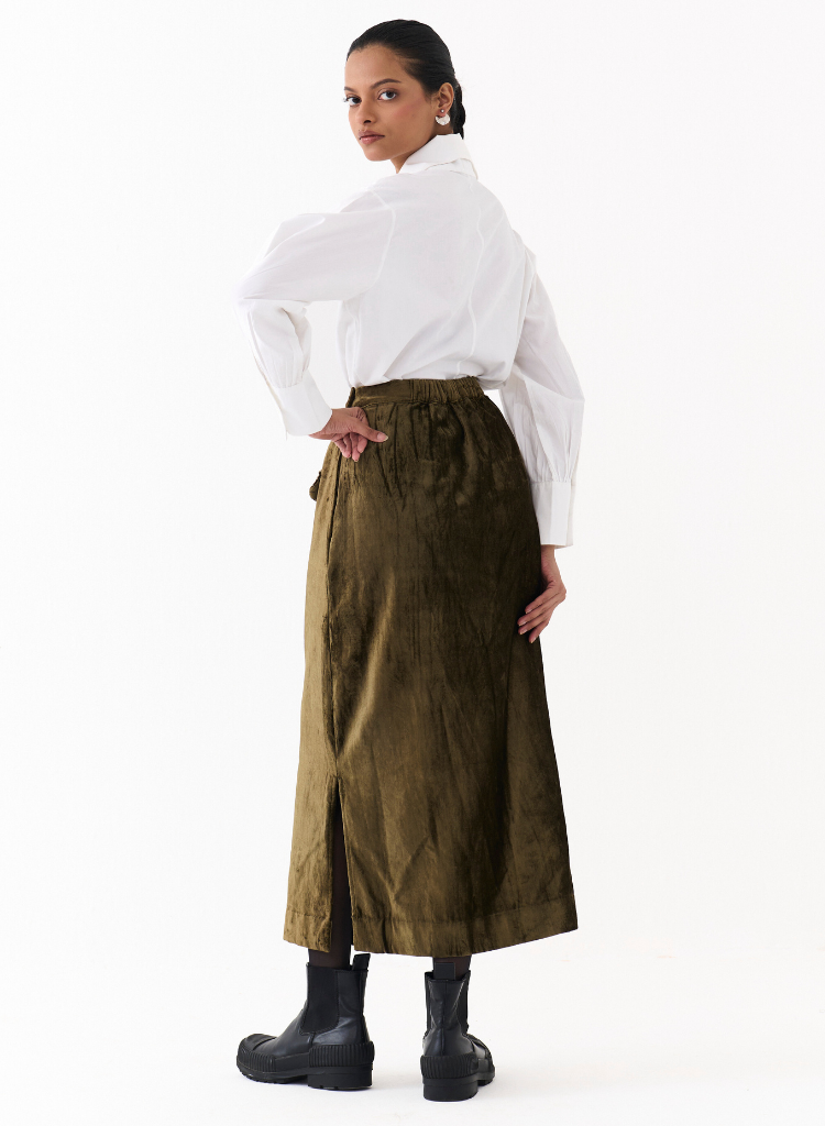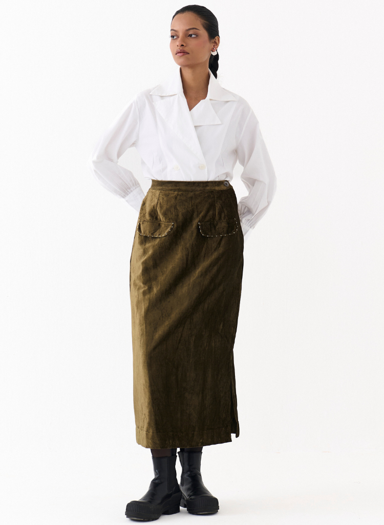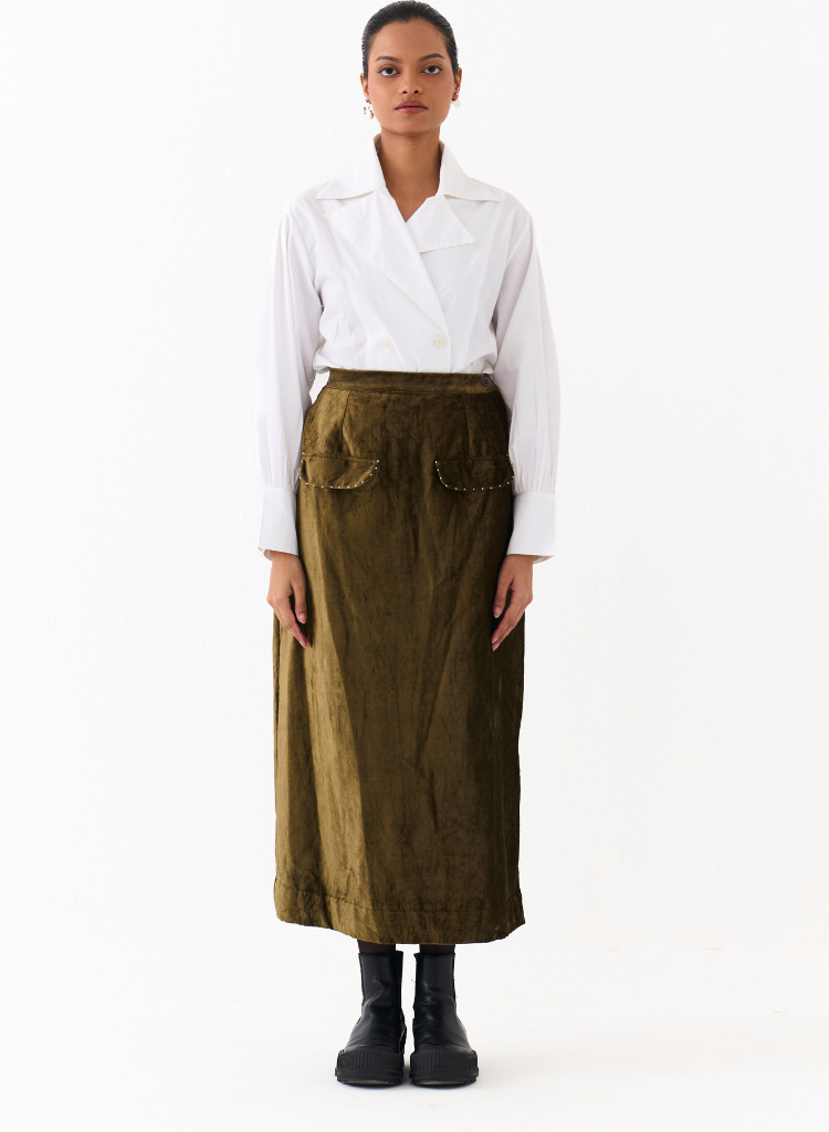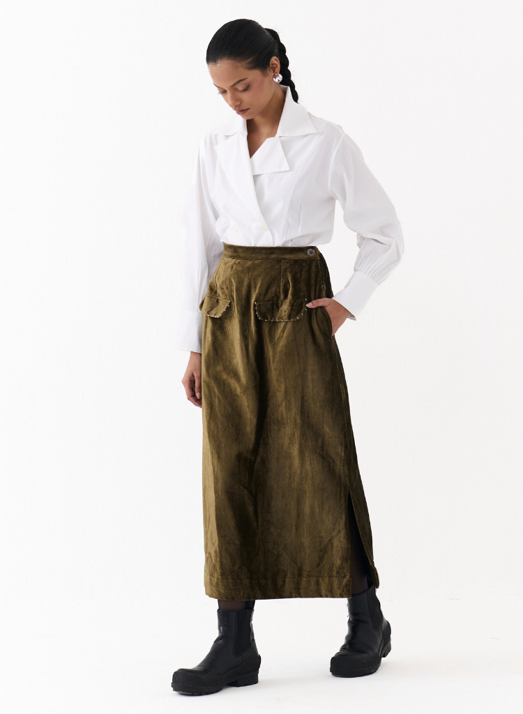 A regular fitting long sleeve shirt featuring a double breasted notch collar. Length 24". The model is 5'7" & is wearing size S.