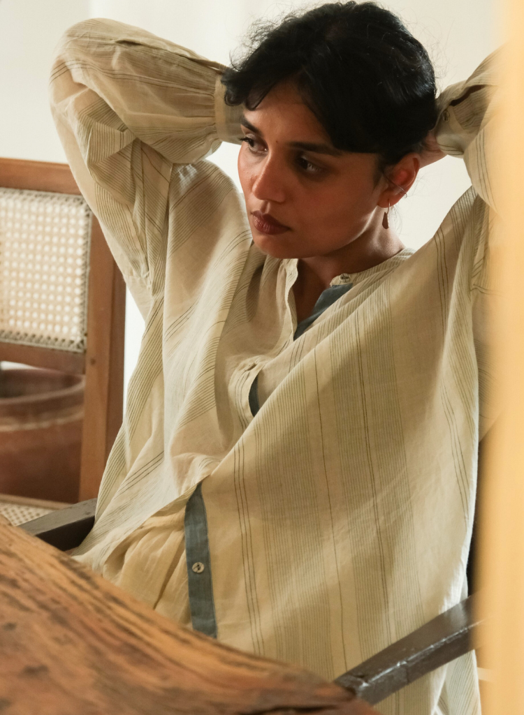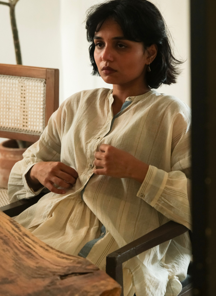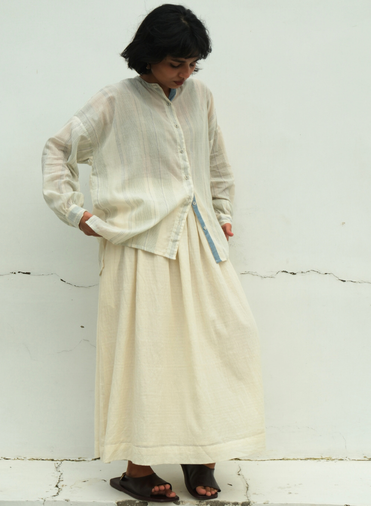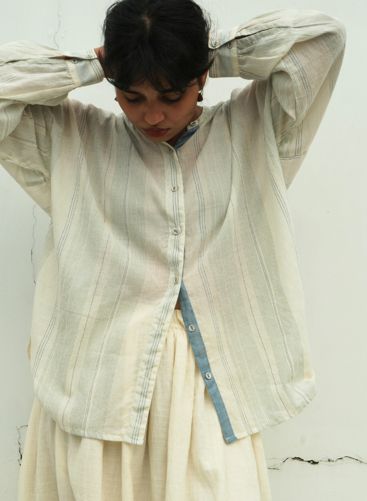 An oversized shirt featuring box pleats, a band collar and side slits. Length 26". The model is 5'2" and is wearing a size XS-S.