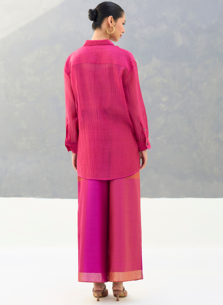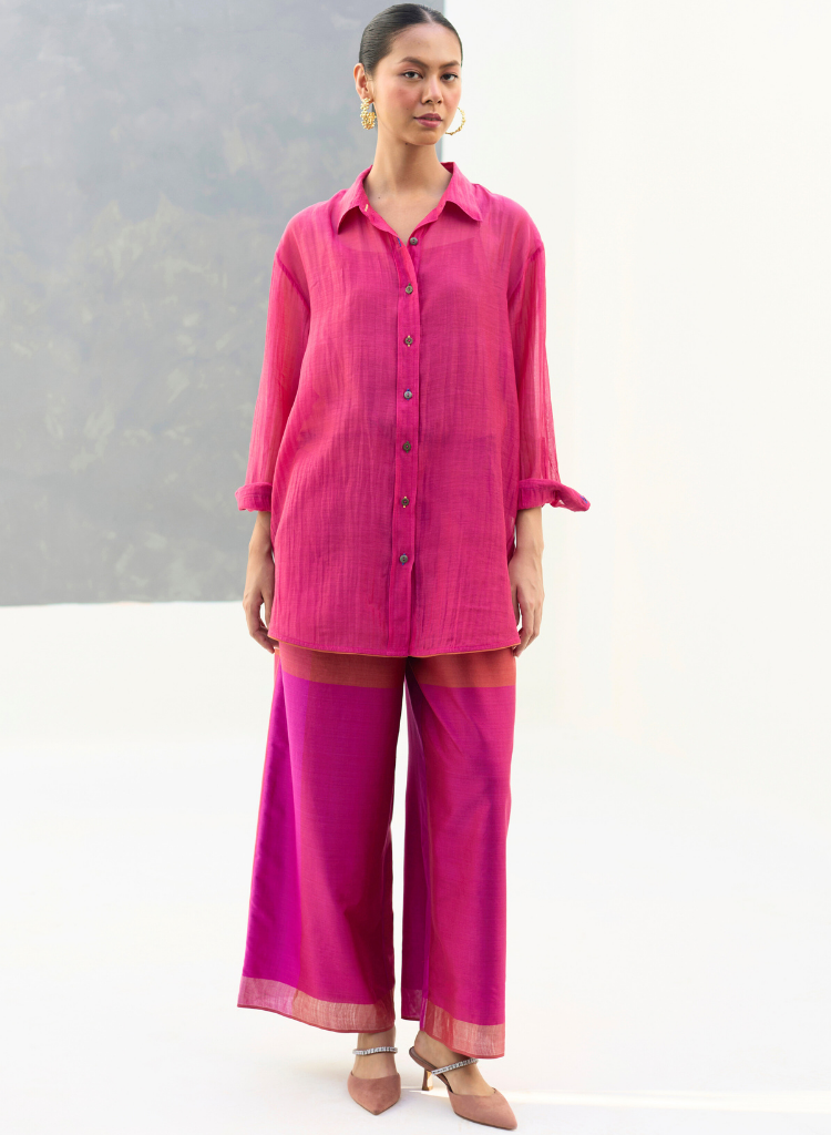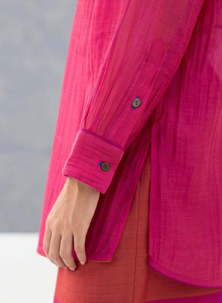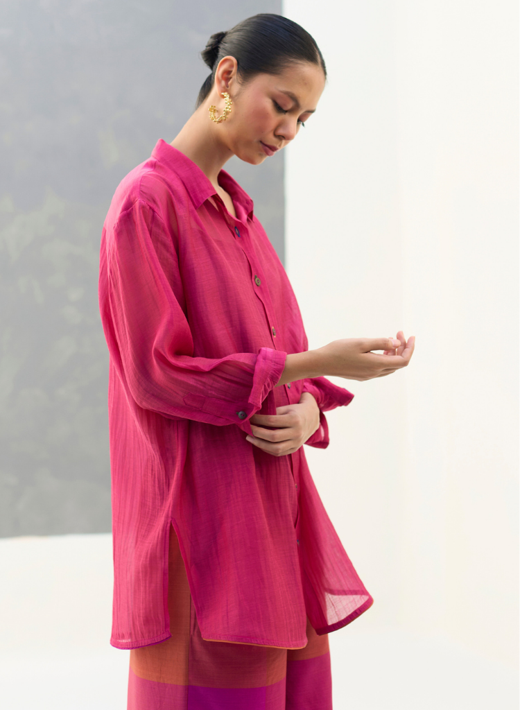 A versatile sheer shirt designed with colourful button-holes paired with mix of unique brass buttons. An intricate piping in contrasting fabric is added to the cuff and bottom hem. Comes with a pure cotton slip. Length 31". The model is 5'8" and is wearing a size S-M.