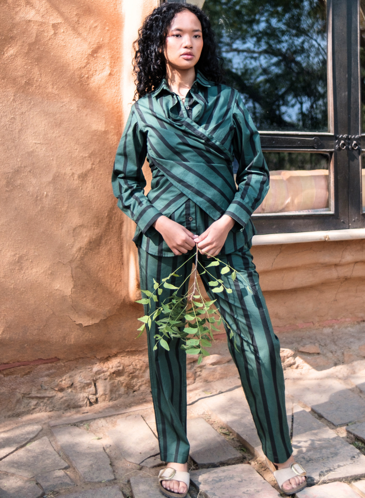An oversized shirt that can also have a cinched waist with wrap detail in the front and buttoned fastening at the back featuring a classic collar and long cuffed sleeves. The model is 5'7", and is wearing size S.