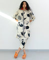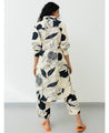 A two-piece set pairing the Pomegranate Tunic and matching pants. The printed tunic shirt features a front button placket, a high low curved hem, and cuffed sleeves. Front length 36", Back length 40". The matching pants feature a fitted front and elasticated back. Length 36". The model is 5'7" and is wearing size M.