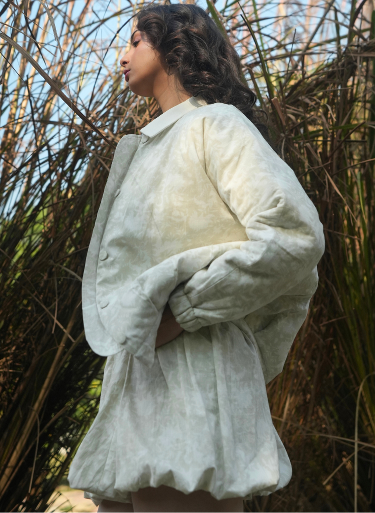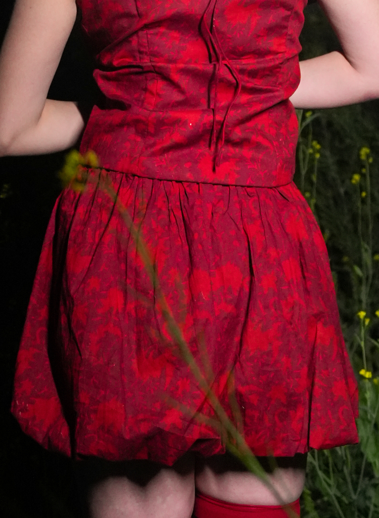 A mini skirt that floats just away from the body while keeping a clean, tailored waist. Soft gathers fall from the waistband into a rounded, cloud‑like hem. Length 14". The model is 5'8" and is wearing a size XS.