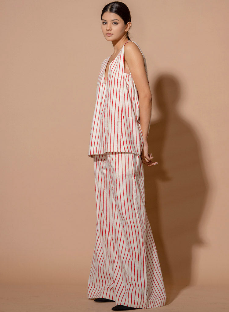 A two-piece set paring the Aloe Top and Cinnamon Pants. The relaxed-fitting striped top with slightly gathered side panels features a plunging V-neckline. The relax-fitting pants with a stripe pattern feature a flared hem. The model is 5'6" and is wearing size S.