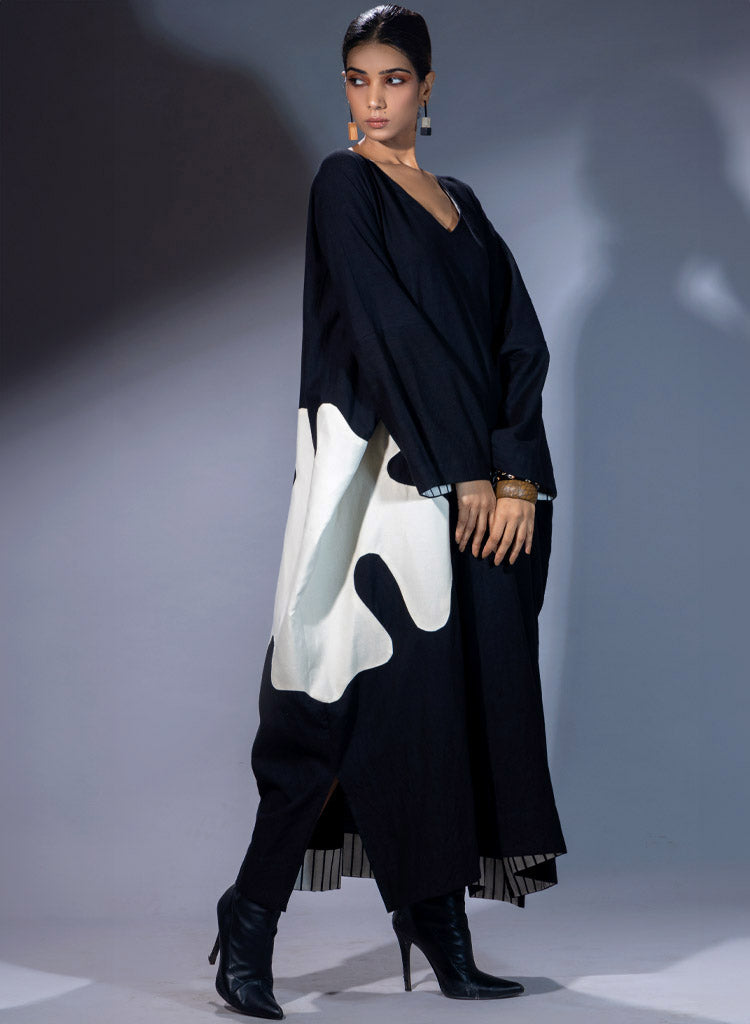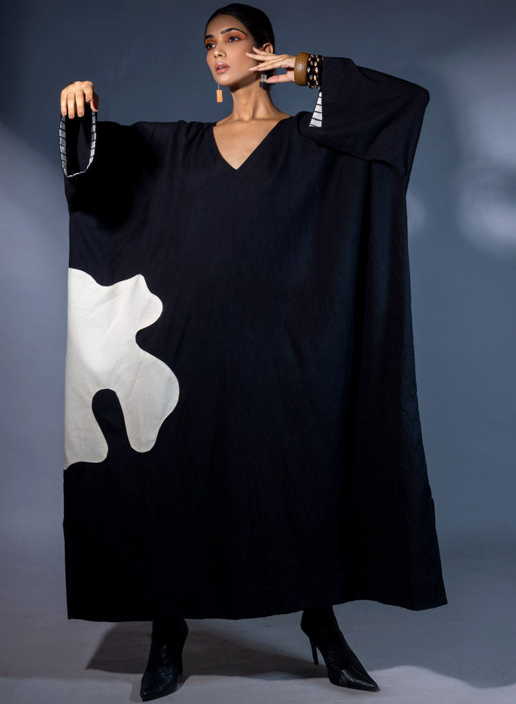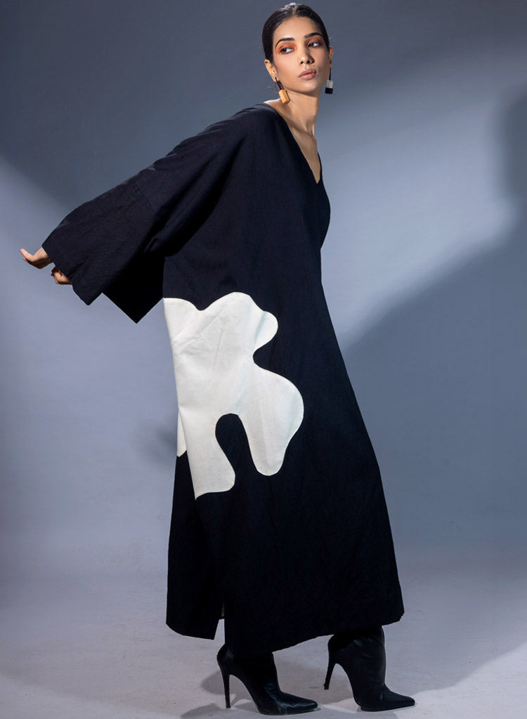 A relaxed-fitting maxi dress with contrast appliqué and side slits featuring a V-neckline and long sleeves. Length 51", Chest 86". The model is 5'8" and is wearing a free size.