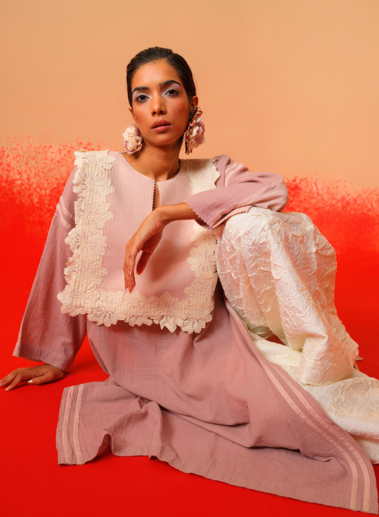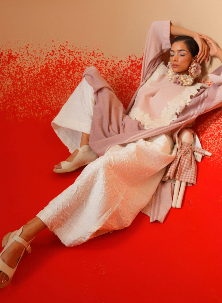 A two-piece set pairing the Fern Tunic and the Root Pants. The statement tunic features a gilet-style overlay with floral motifs, a straight V neck and side slits. Length 45". The model is 5'8" and is wearing free size. Made in crushed cotton. The crushed pants feature an elasticated waist and inseam pockets. Length 40". The model is 5'8" and is wearing size S. Made in Mysore silk.
