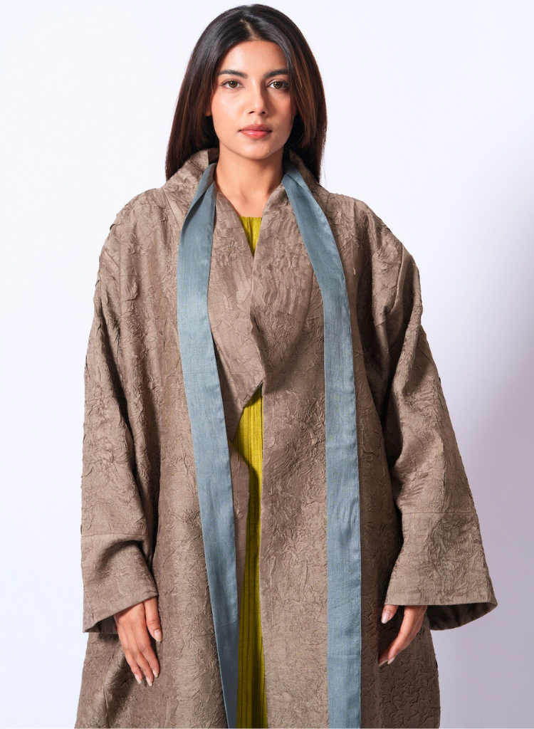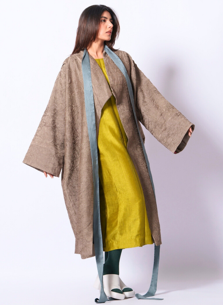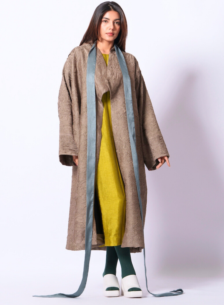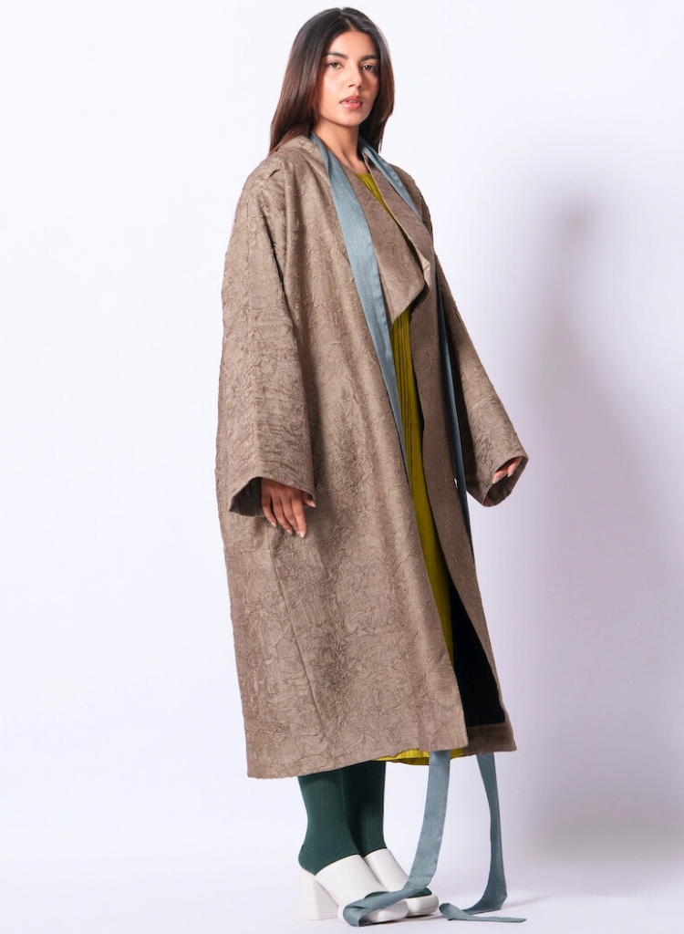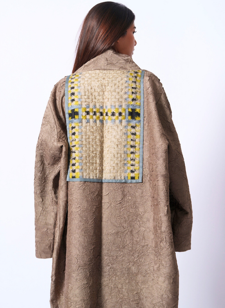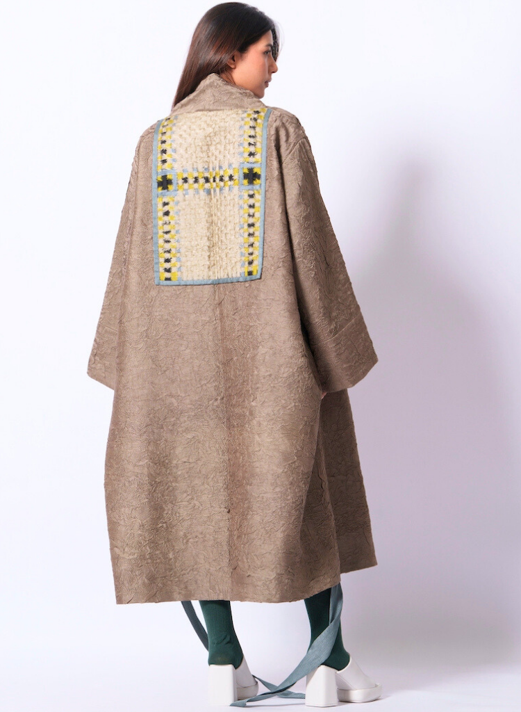 An oversized jacket featuring an intricately hand-woven patch at the back. Length 47", Shoulder 20", Bust 65". The model is 5'8" and is wearing S.