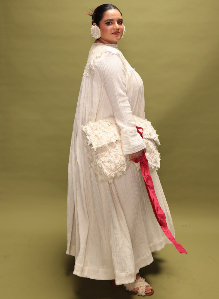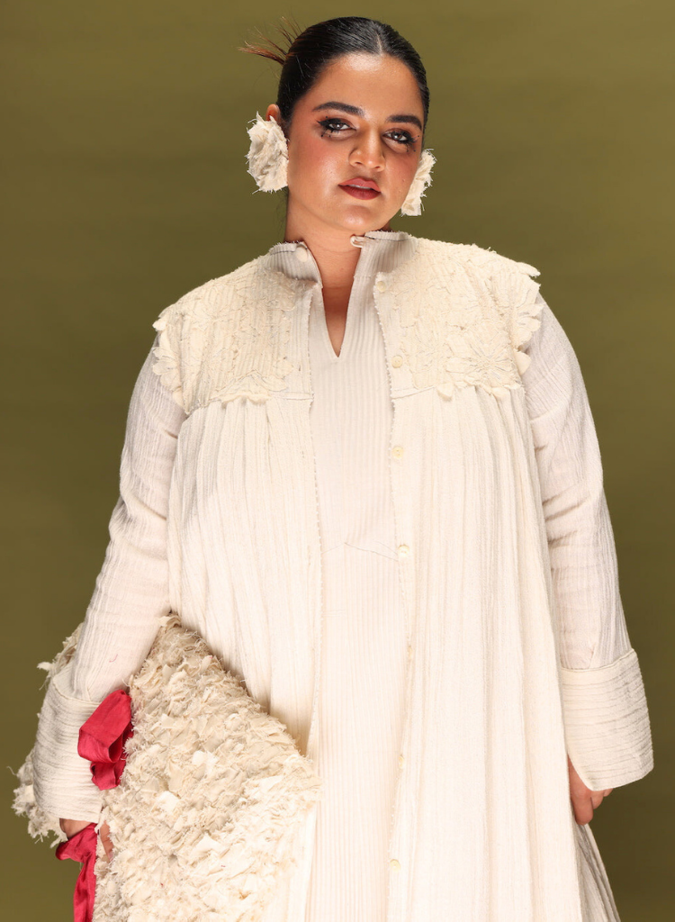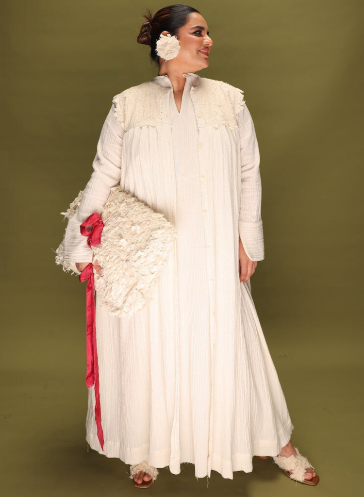 A romantic maxi dress with an overlap design, a V neck with a rouleau button closure, hand-stitched floral motifs and elongated cuffs. Length 52". The model is 5'8" and is wearing size S.