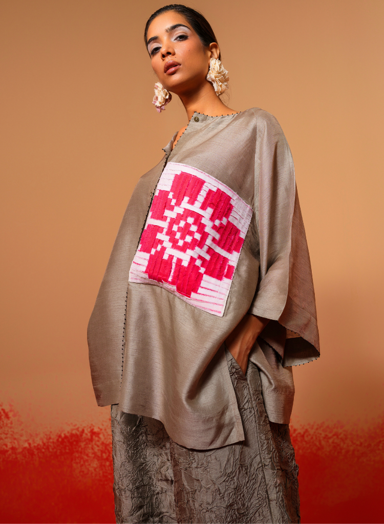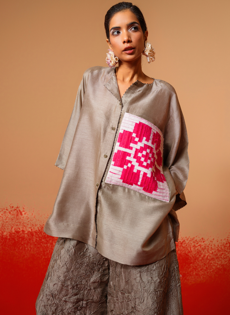 A two-piece set pairing the Root Shirt and the Root Pants. The oversized button-down shirt features a contrasting statement front pocket handwoven from delicate strips into blooming floral motif and 3/4th sleeves. Length 27.5. The model is 5'8" and is wearing free size. The crushed pants feature an elasticated waist and inseam pockets. Length 40". The model is 5'8" and is wearing size S. Made in Mysore silk.