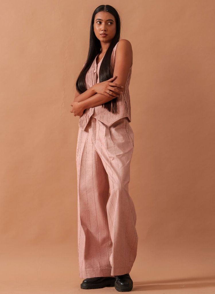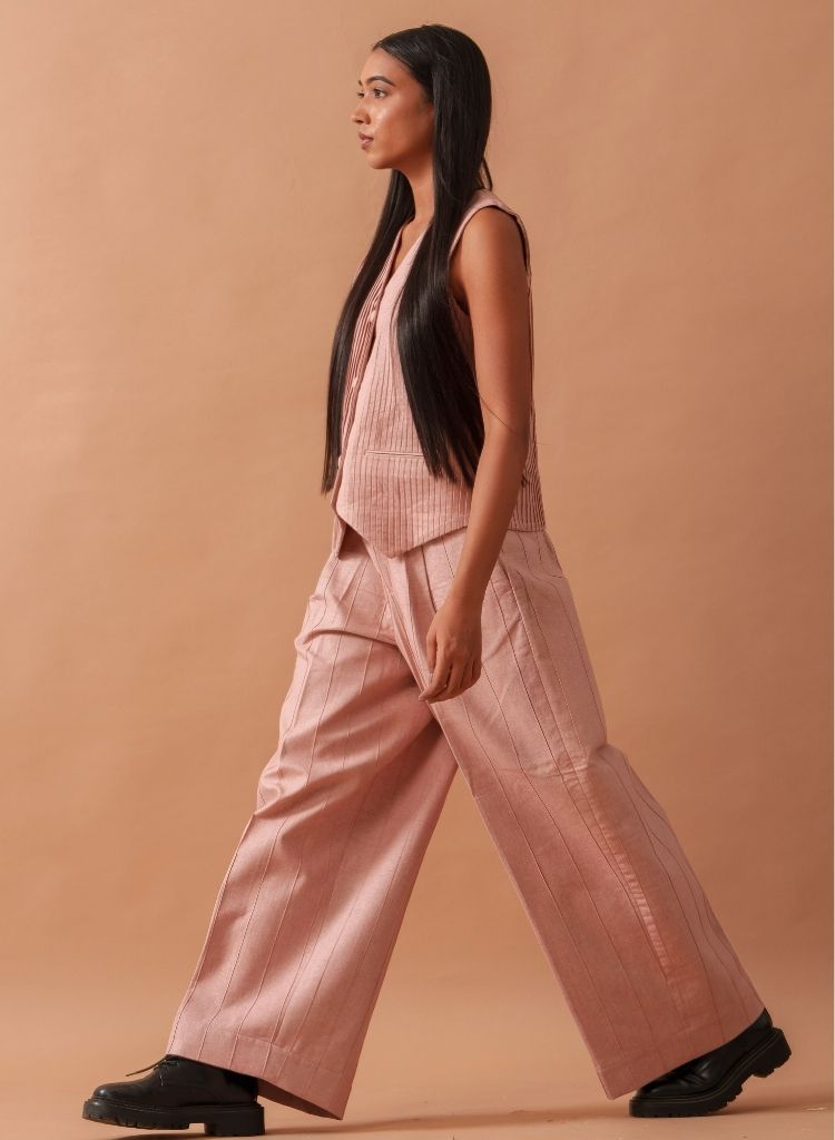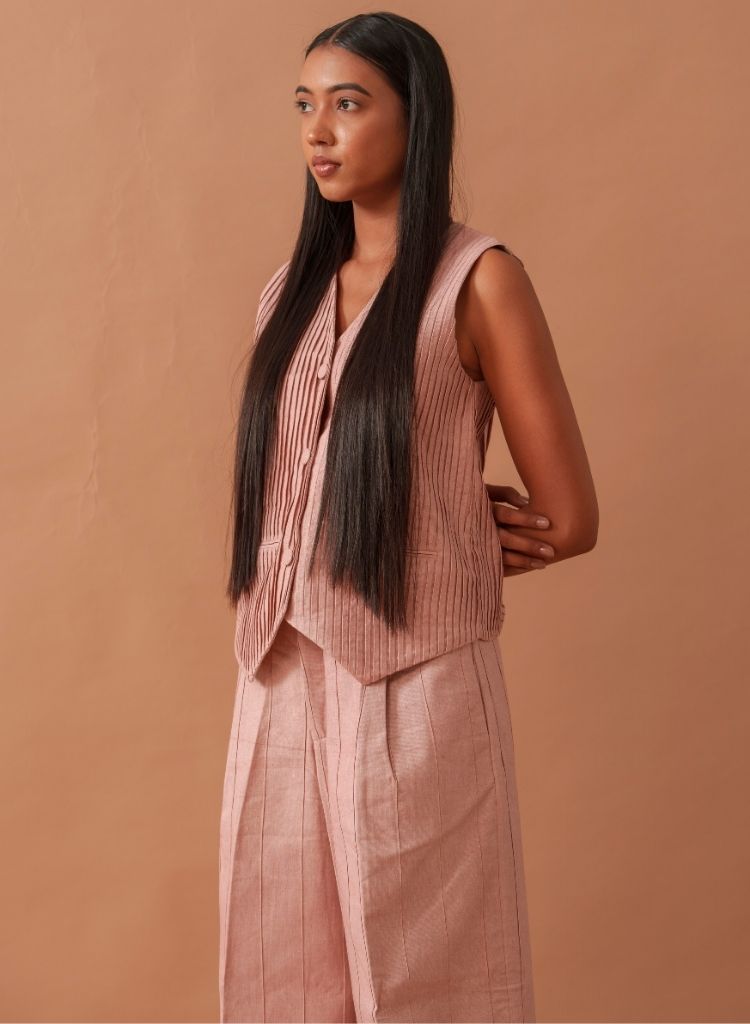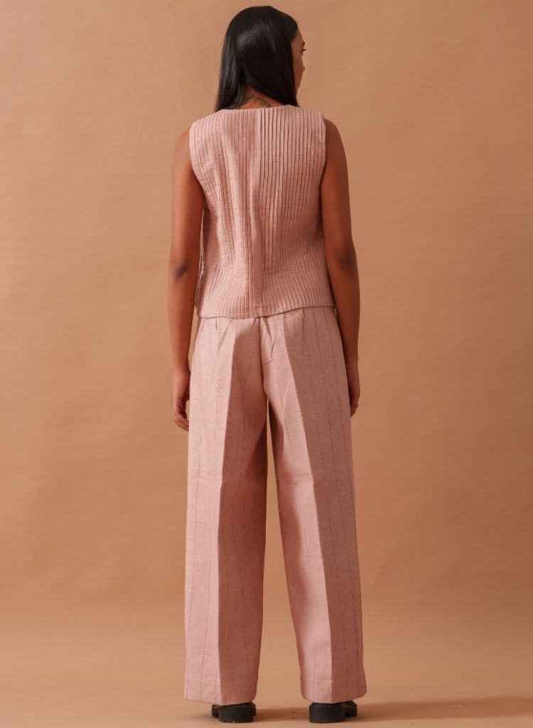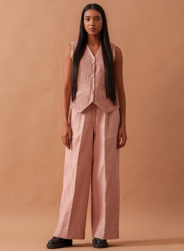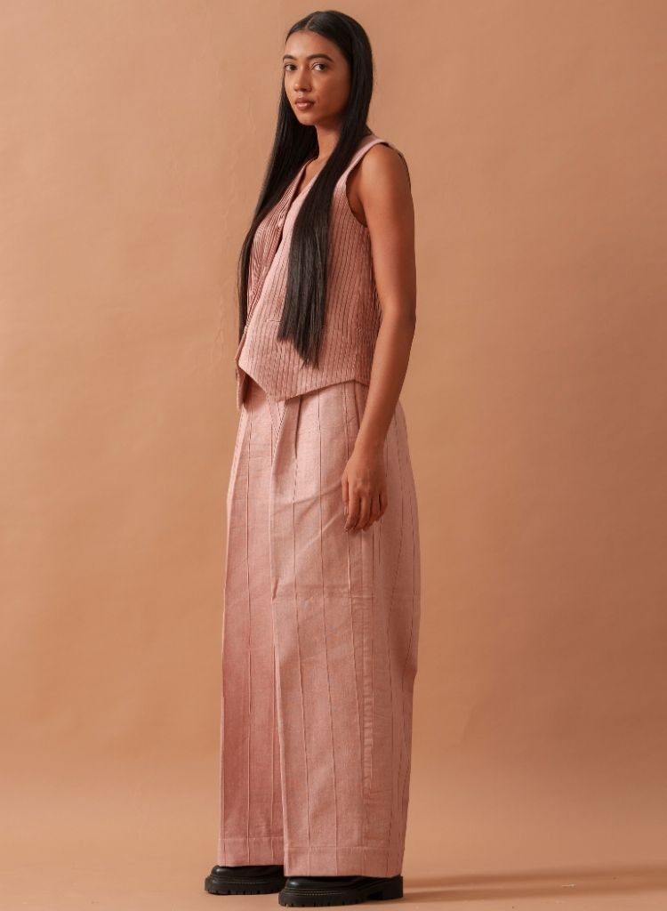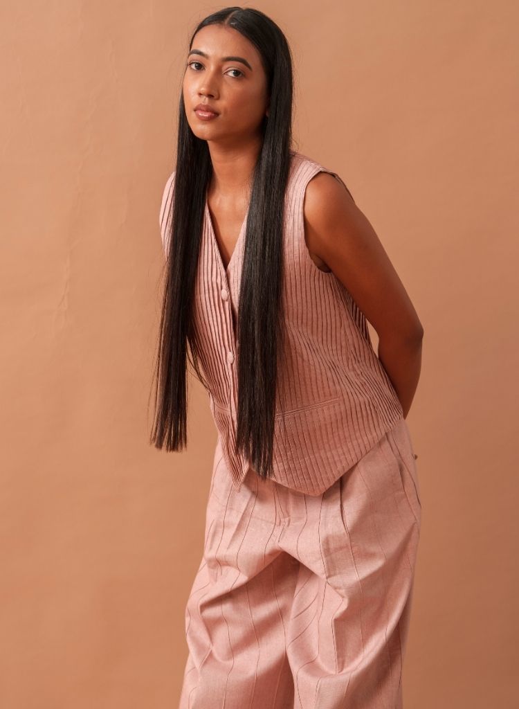 A two-piece set pairing the Sunflower Vest and the Sunflower Pants. The classic tailored vest with hand-sewn pleats and welt pockets features a center front button-down placket and a V-neckline. Length 21". The tailored boxy-fitting pants with hand-sewn pintuck detail featuring a centre front zip-button fastening. Length 41.5". The model is 5'8" and is wearing size S.