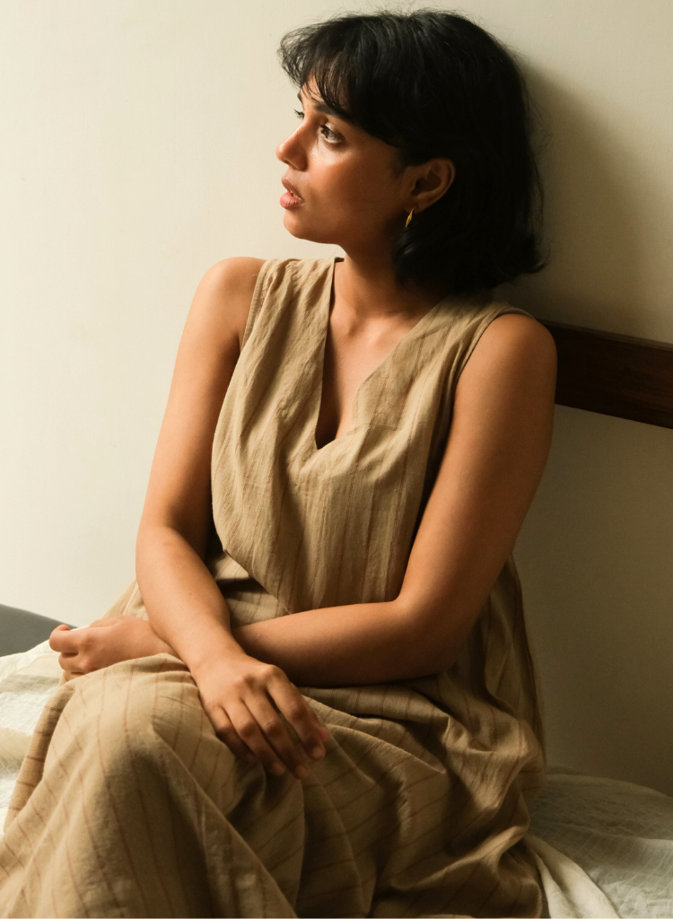 A midi dress featuring a V-neck and side pockets. Length 47". The model is 5'5" and is wearing a size M.