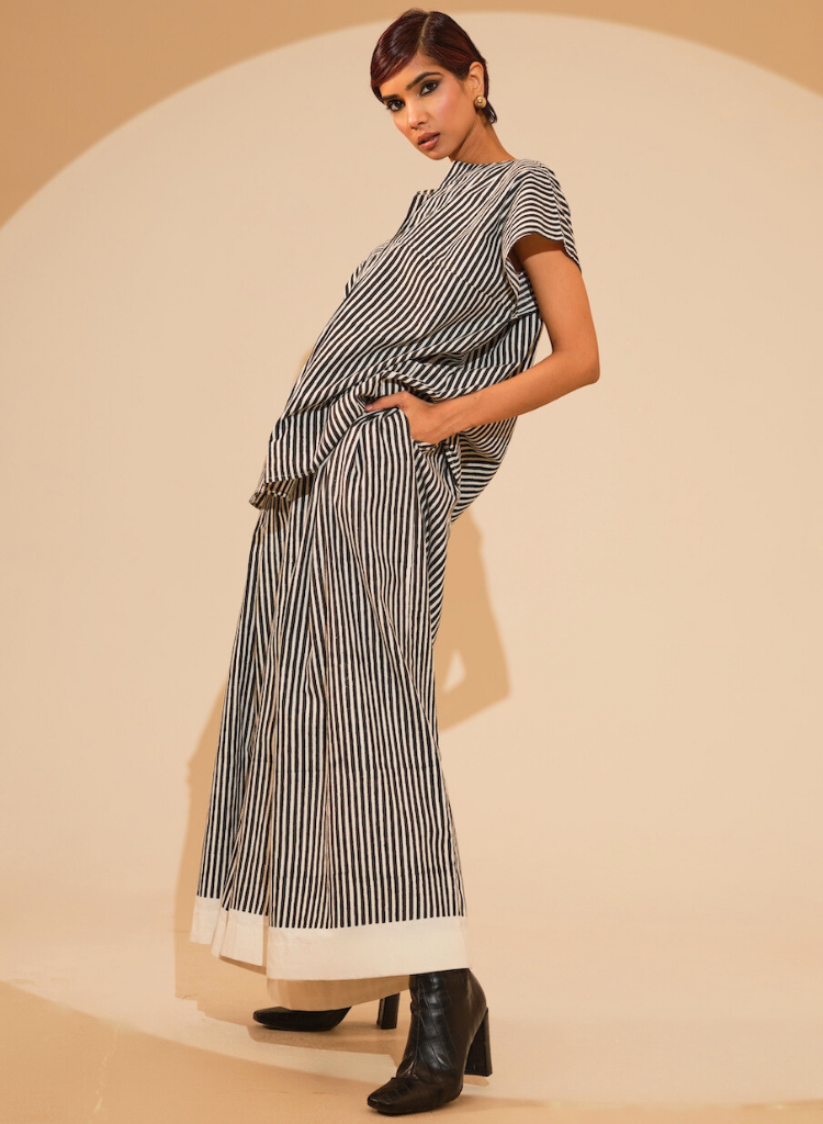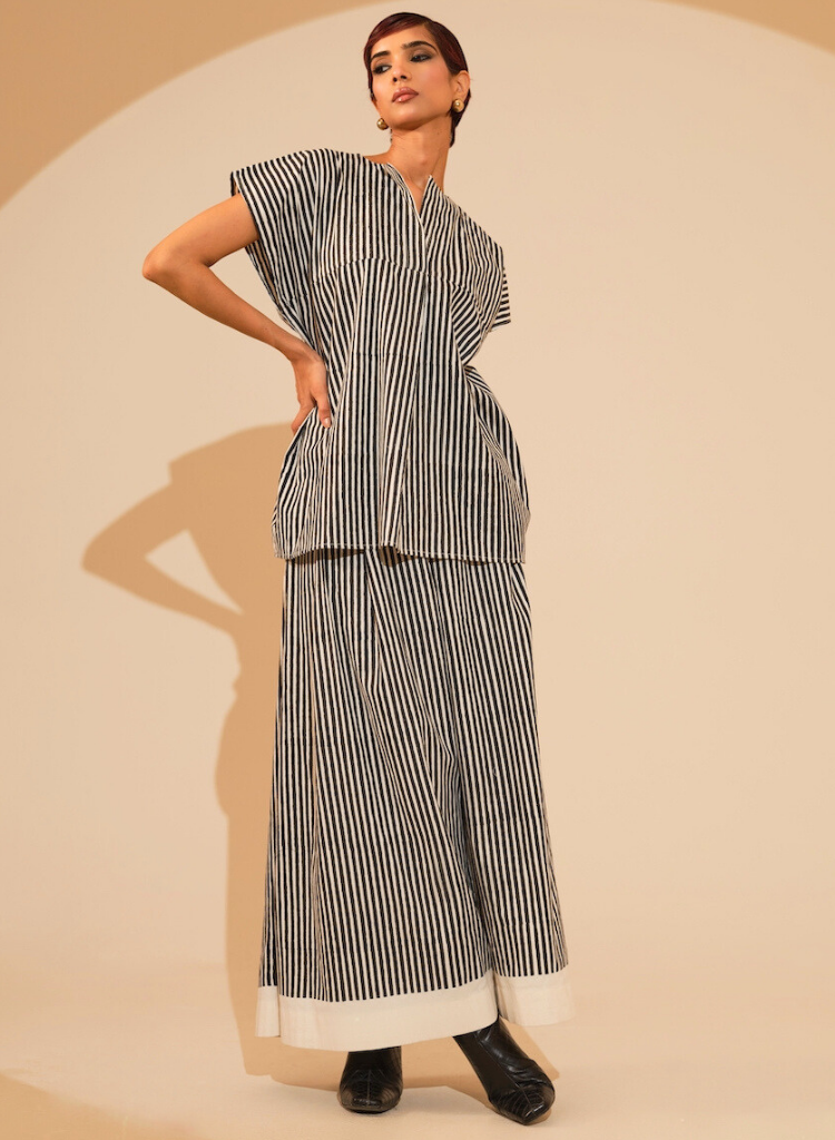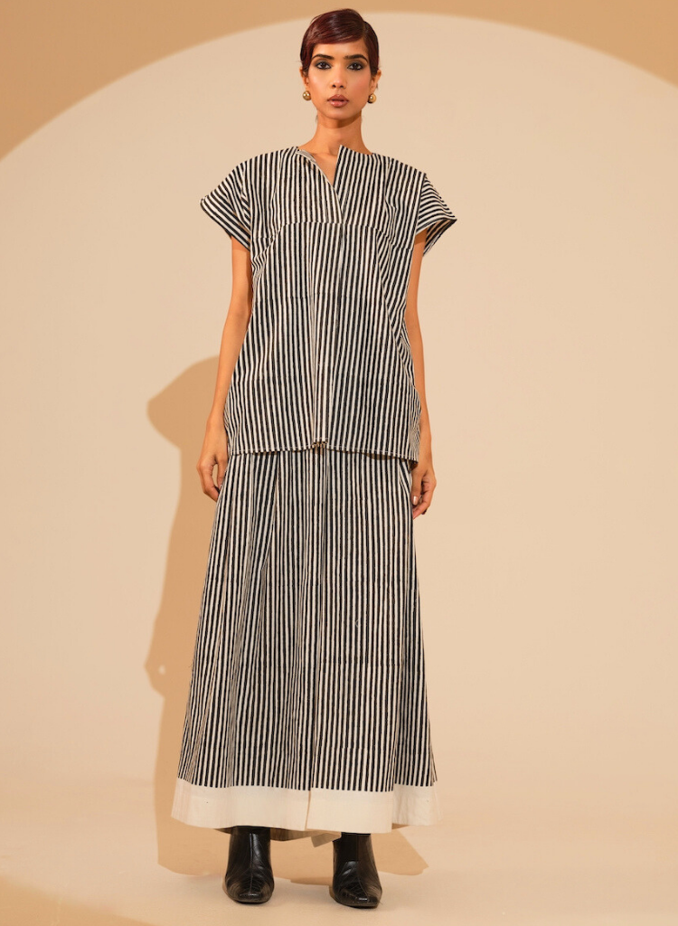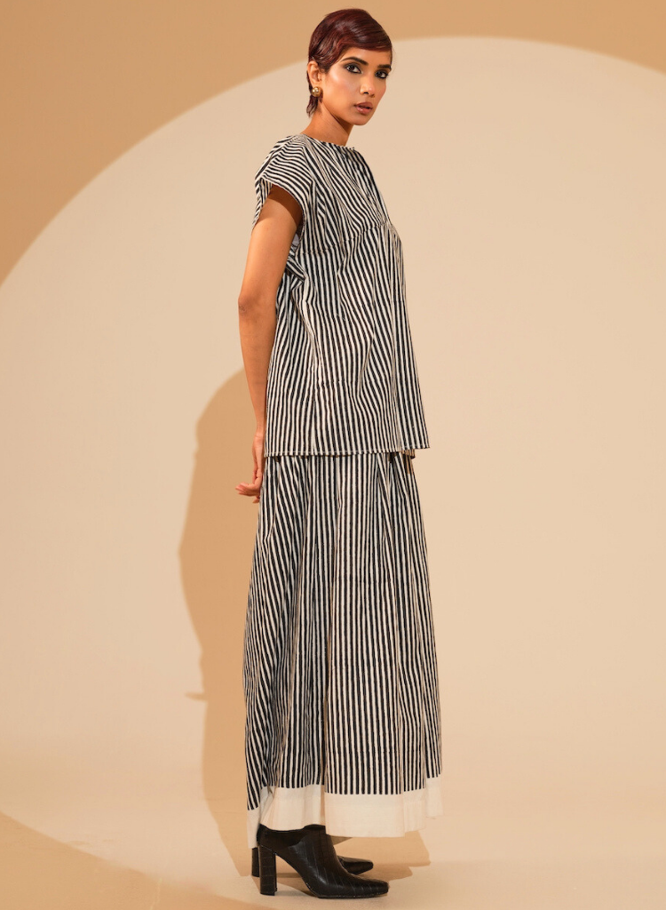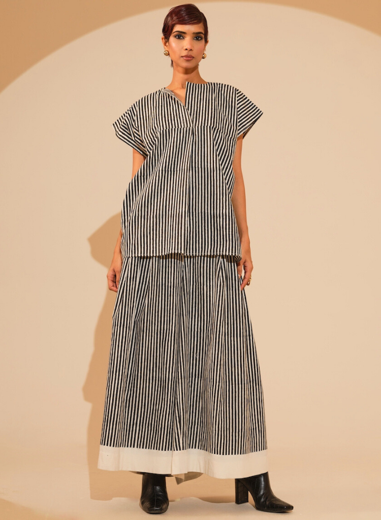 An oversized free-flowing top with hand-block printed stripes and a front overlap slit placket featuring short sleeves and pleats in the front. Length 27". The model is 5'8" and is wearing free size.