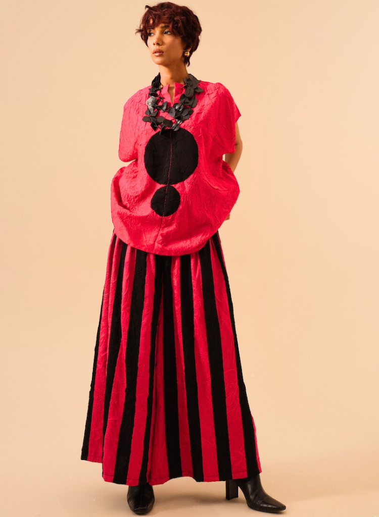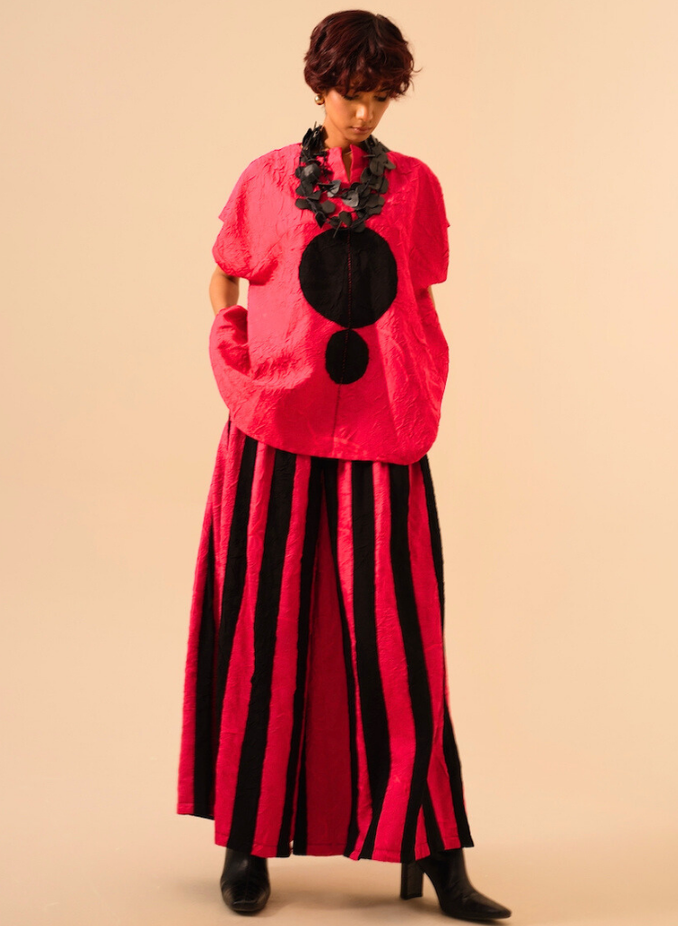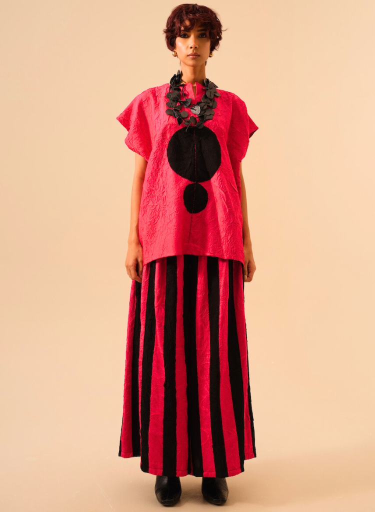 A two-piece set pairing the Lane Top and the Twin Pants. The one-size top features a hand-embroidered circular appliqué rendered in traditional Kantha stitching. Length 27". The flared trousers feature delicate hand-sewn pleats and is finished with a full belt and zip closure for a seamless fit. Length 38". The model is 5'8" and is wearing S.