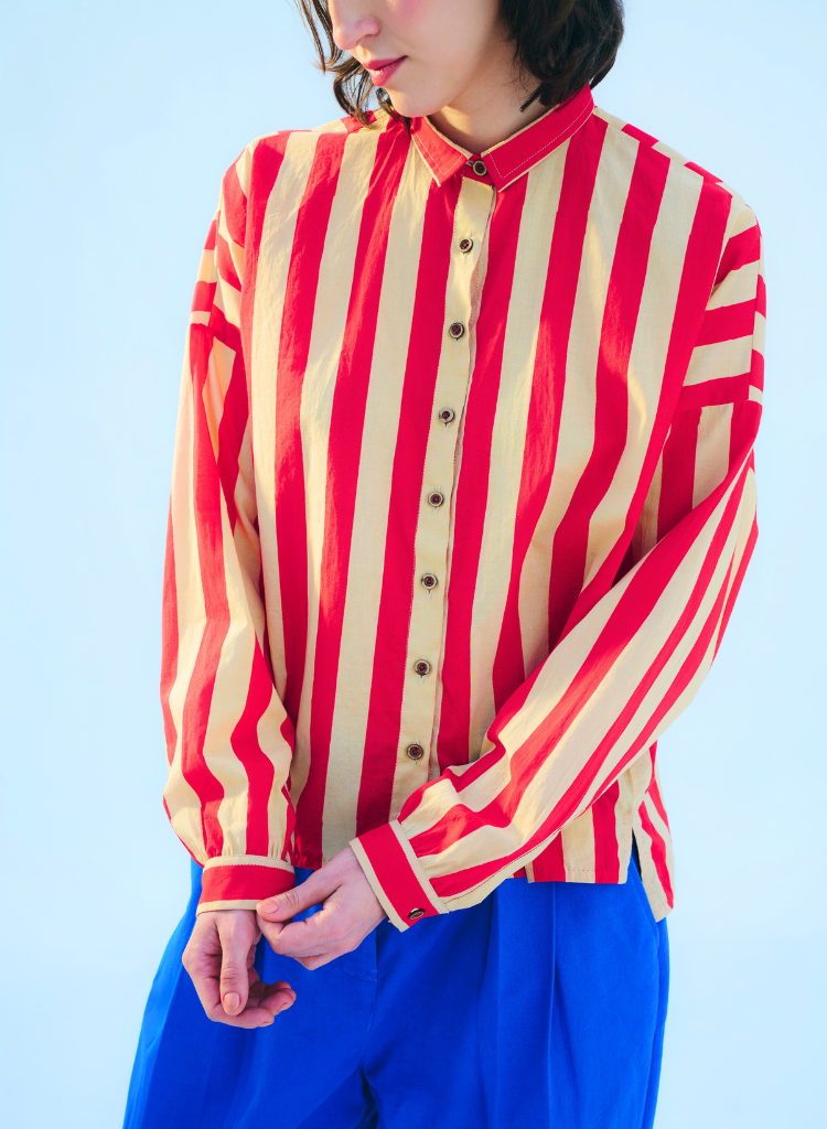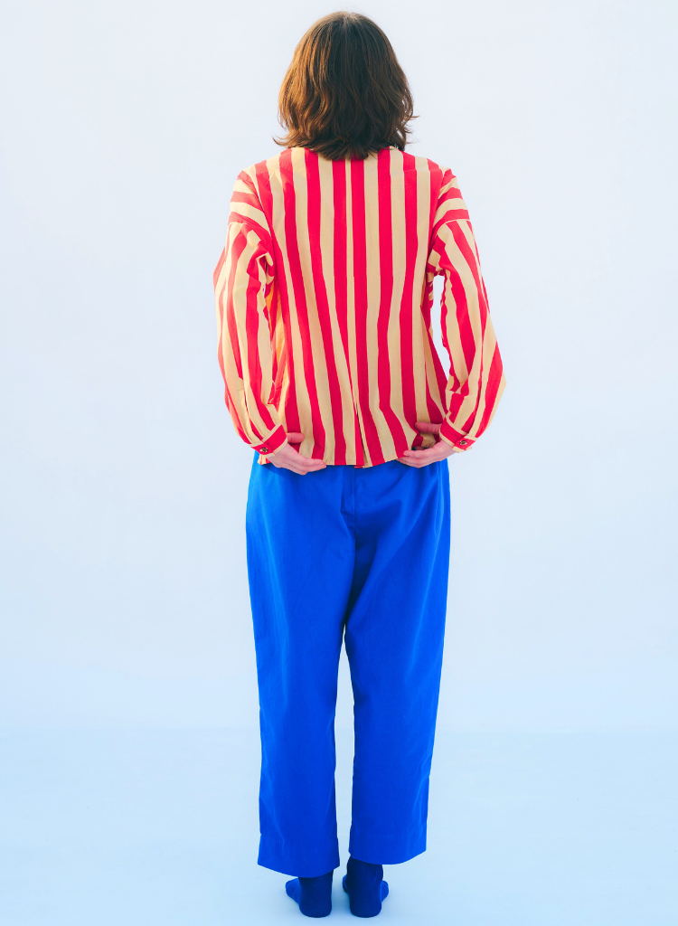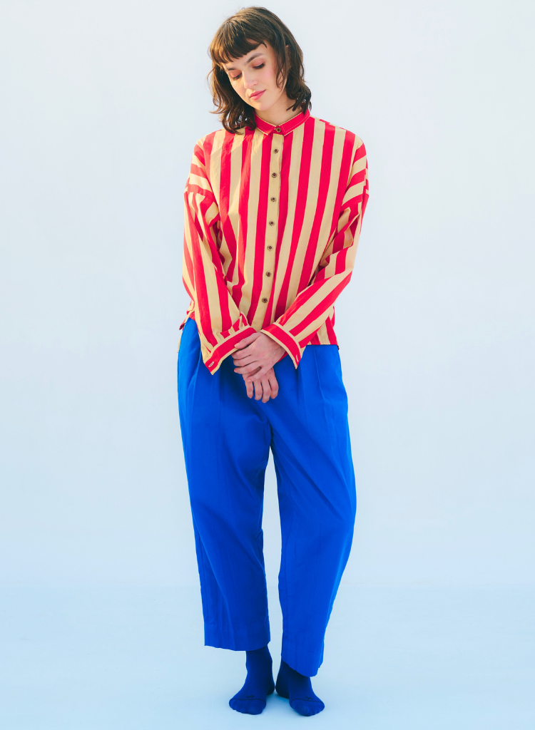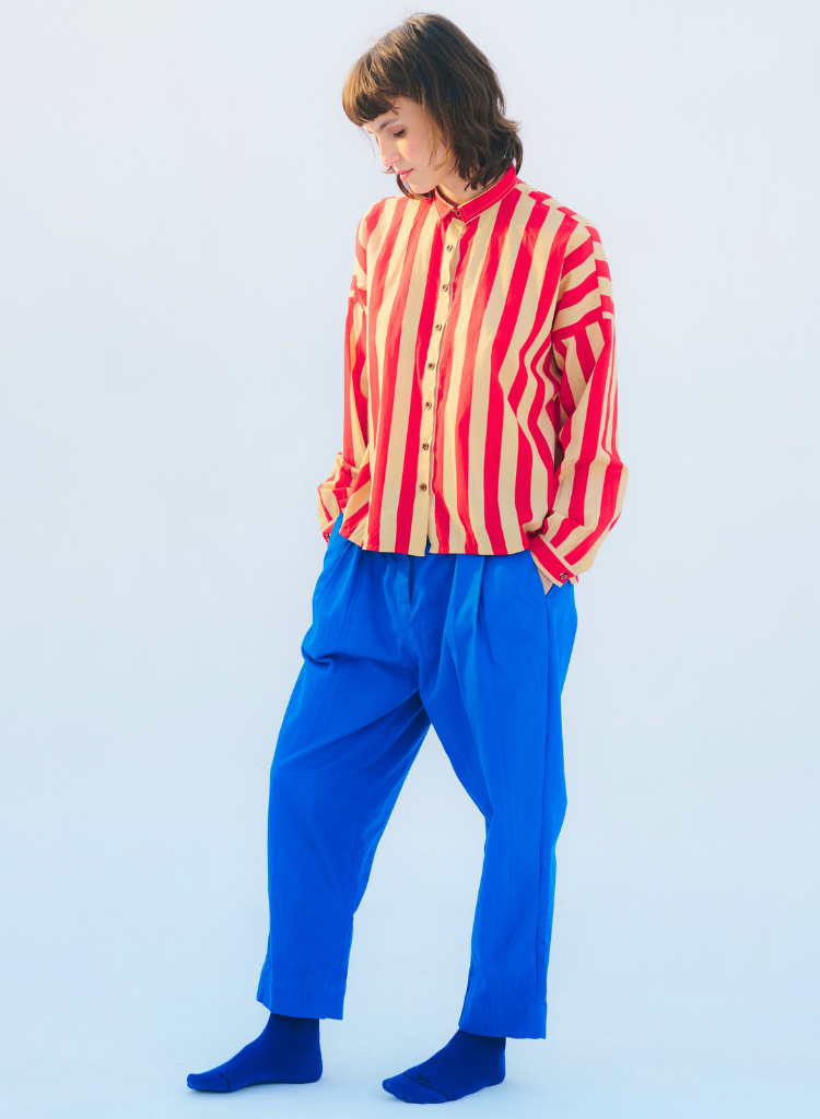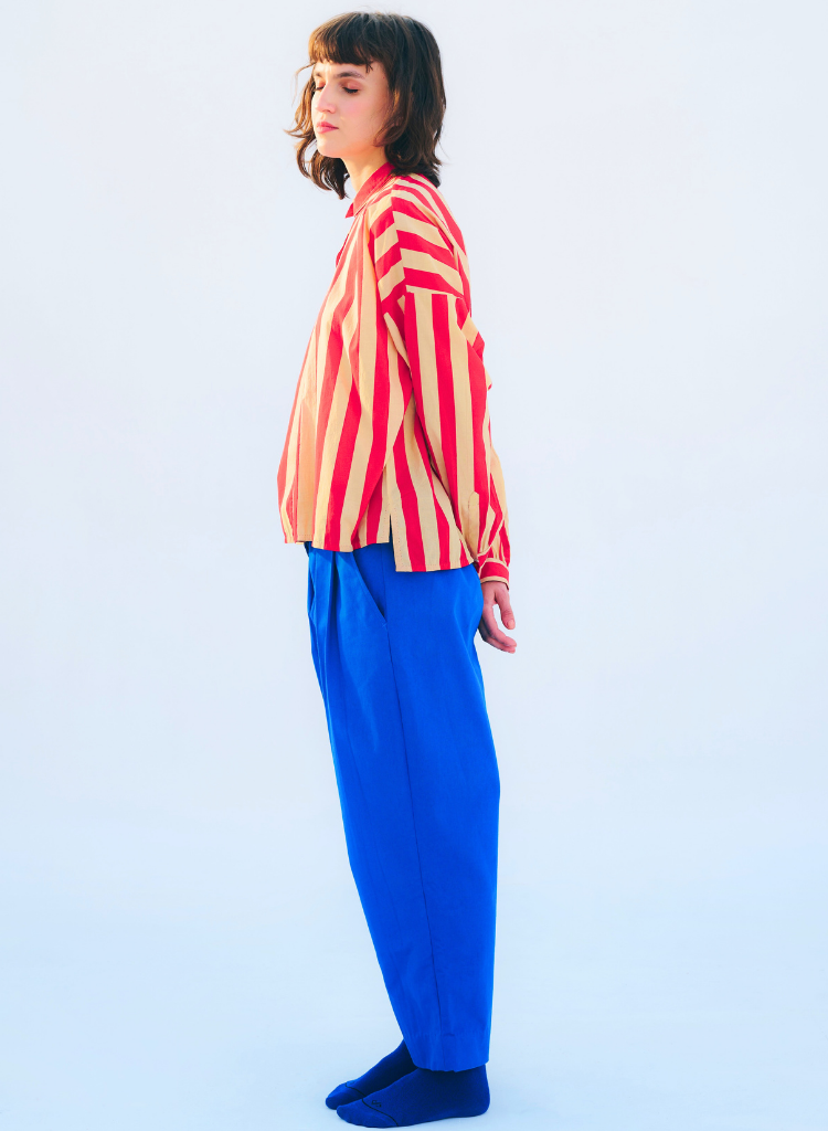 A two-piece set pairing the Quinn Shirt and the Carrot Pants. The anti-fit shirt features front buttons, kimono sleeves and drop shoulder. Length 23". The baggy fitting pants feature a fixed waist, a zipper button closure, belt hoops and inseam pockets. Length 36". The model is 5'9" and is wearing a size S.