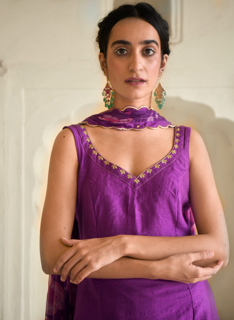 A three-piece set pairing a kurta, a straight pants and dupatta. The sleeveless kurta features a sweetheart neckline embellished with beads and sequins hand work. Length 48". The pants features an elasticated back. Length 38". The dupatta features cut work all over the border along with sequin hand work. The model is 5'9" and is wearing a size S.