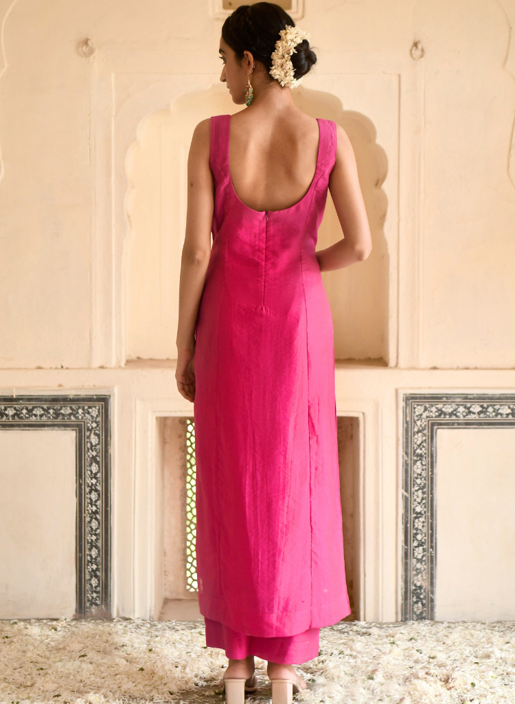 A three-piece set pairing a kurta, a straight pants and dupatta. The sleeveless kurta features a square neck in the front embellished with beads and sequins hand work and scoop neckline at the back. Length 48". The pants features an elasticated back. Length 38". The foliage printed dupatta features cut work all over the border along with sequin hand work. The model is 5'9" and is wearing a size S.