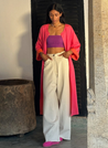 A fitted sleeveless crop top with a wrap silhouette in half-and-half colour featuring a V-neckline and tie-up fastening. The model is 5'9" and is wearing size S.