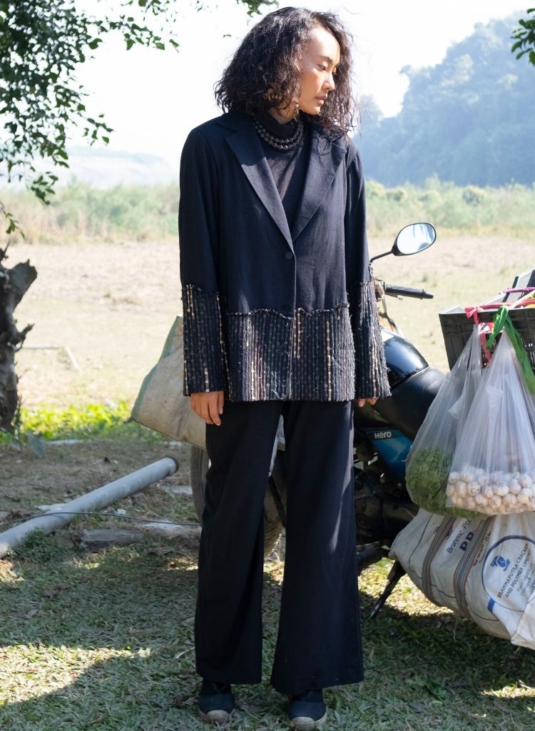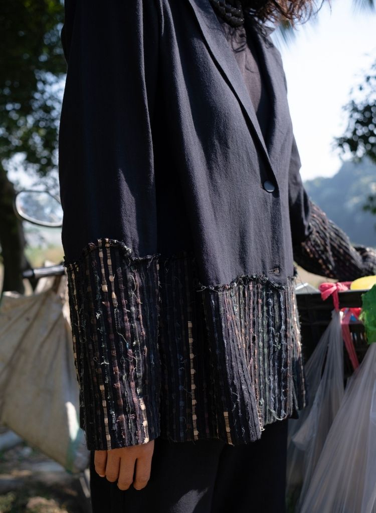 An oversized blazer with a hem patch design featuring a lapel collar and long sleeves. The model is 5'7" and is wearing size S.
