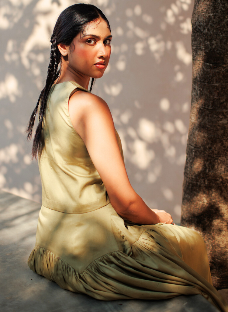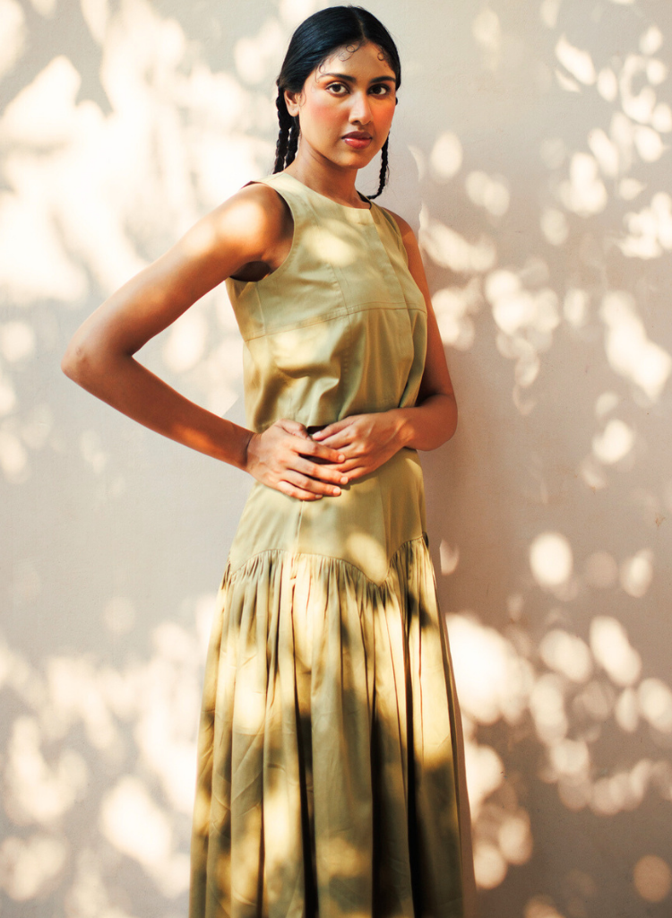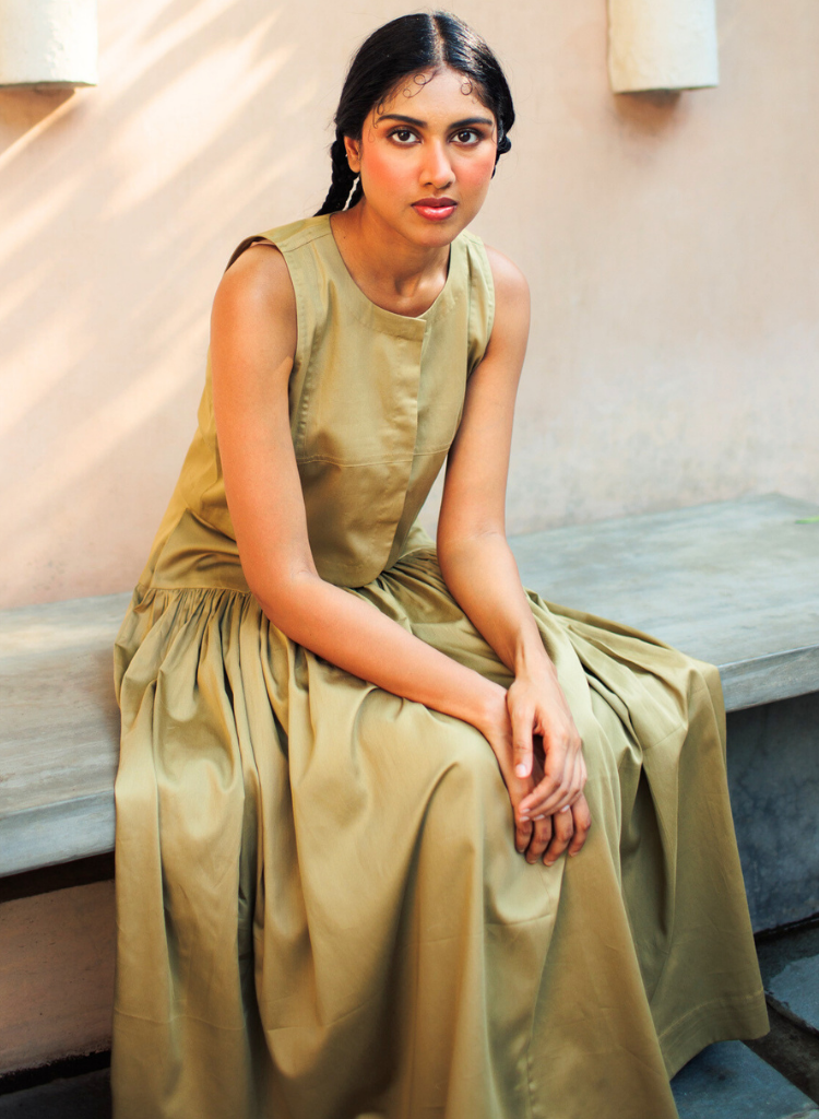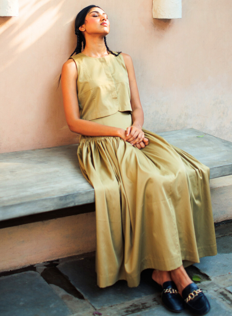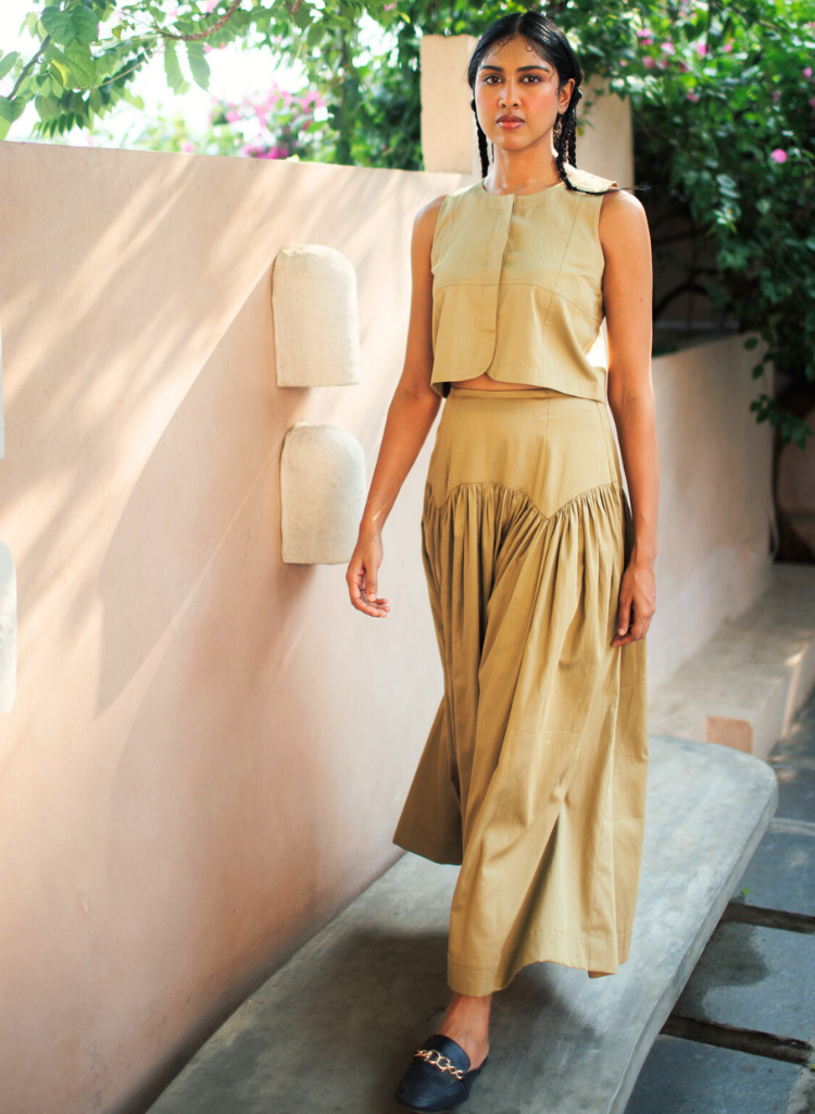A two-piece set pairing the Harper Top and the Harper Gathered Skirt. The panelled, button-down top features a hidden placket, a rounded hemline, and a classic crew neckline. Length 16.5". The soft gathered skirt with smart panelling details along the waist features a pocket and a concealed zip fastening. Length 38". The model is 5'7" and is wearing size S.