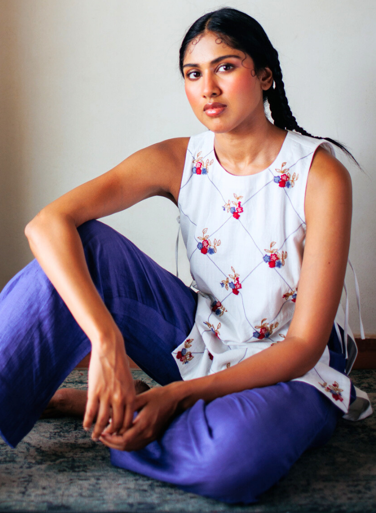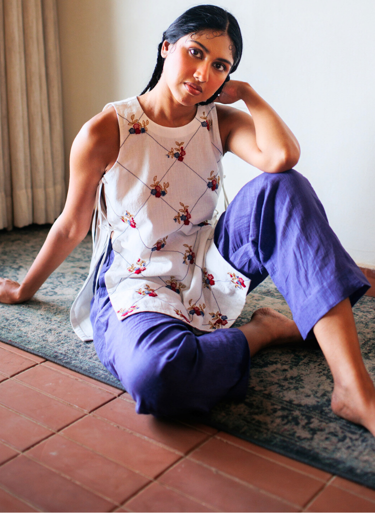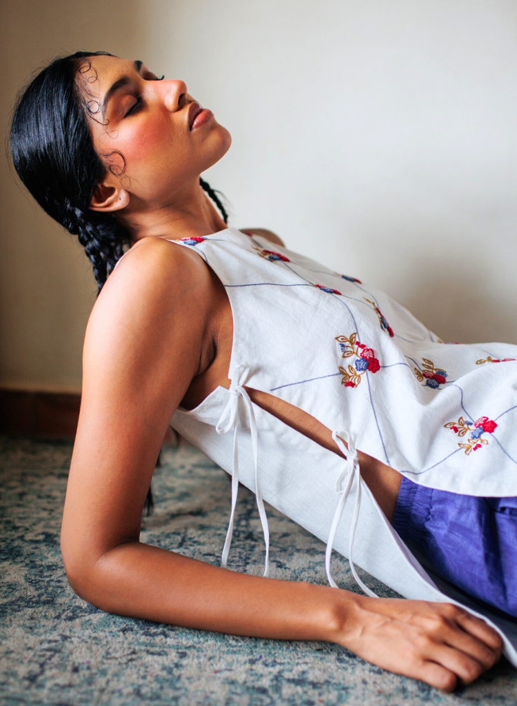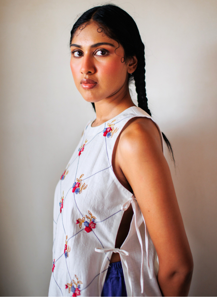 An oversized bib top with traditional Aari embroidery featuring side tie-ups and a keyhole opening at the center back for easy wear. Length 29". The model is 5'7" and is wearing size S.