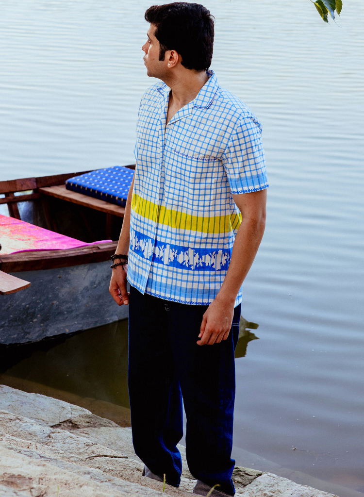 A relaxed-fitting shirt with blue checkered pattern bringing a classic yet playful touch, while hand-embroidered details on the collar and pocket add subtle artisanal charm. Designed with half sleeves for a laid-back vibe, it’s a versatile piece that pairs effortlessly with denims for an easy, timeless look. The model is 5'7" and is wearing size M.