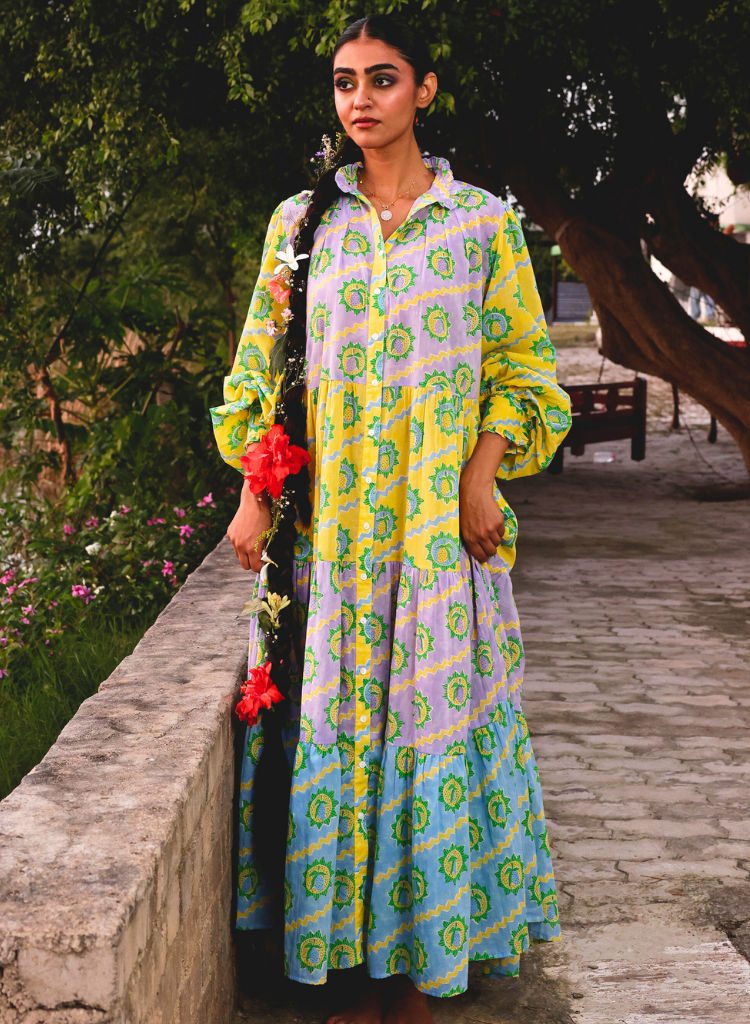 Hand block-printed in Azo-free colours, the Kakori Dress is crafted from mixing three colourways within the print gives the dress a playful energy and a fresh perspective. Cut in an oversized, flowing silhouette with generous volume, it carries an airy elegance that makes it truly special. The long length and puffy sleeves are finished with hand-embroidered details on the collar and cuffs, adding artisanal finesse to this statement piece. The model is 5'8" and is wearing size XS-S.