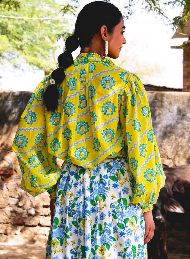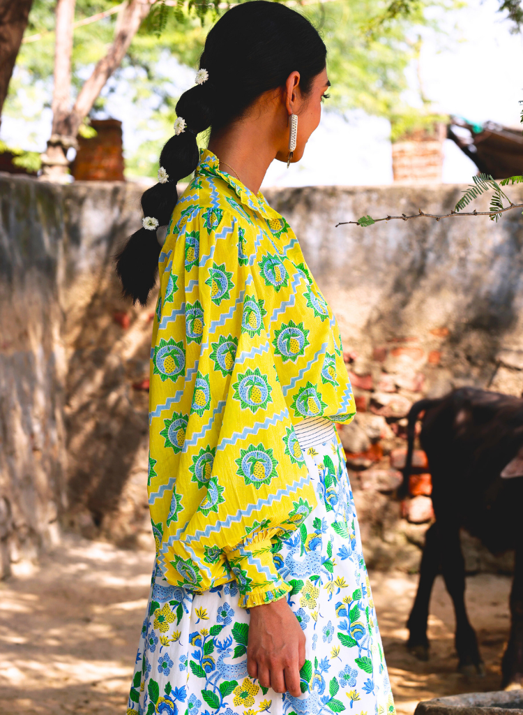 Block-printed in vibrant mango print against a lemon-hued background, the Kakori Shirt is designed with an oversized silhouette and voluminous, pouffy sleeves, it balances drama with ease. Hand-embroidered details on the cuffs and collar lend artisanal finesse, making the piece both playful and refined. The model is 5'8" and is wearing size XS-S.