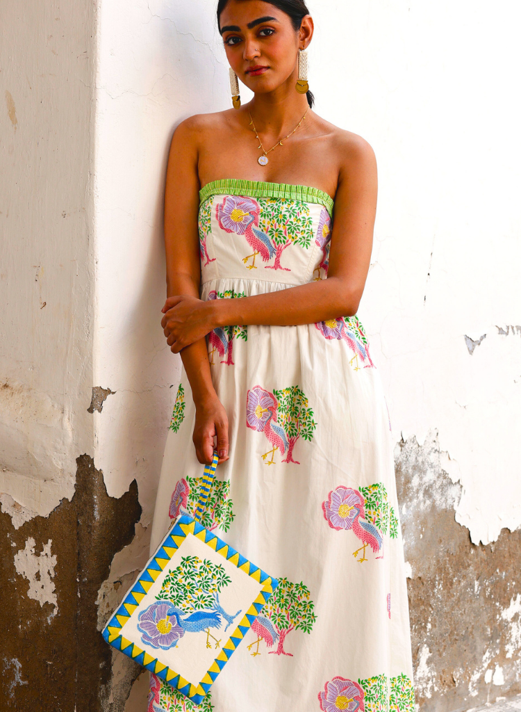 A charming hand block printed pouch featuring Saras crane motifs on both sides framed by colourful triangular borders. The inside is lined with subtle stripe block print, and a golden zipper completes the design with a touch of shine. Compact and practical, it brings together handcrafted artistry and everyday functionality in a fresh, stylish way.