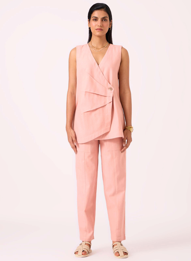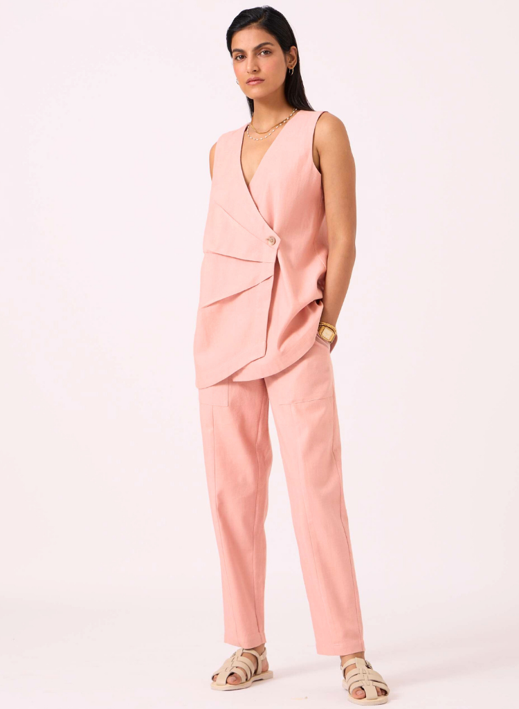 A V-neck draped sleeveless jacket featuring inner tab for an adjustable fit at waist. The model is 5'6" and is wearing size XS.
