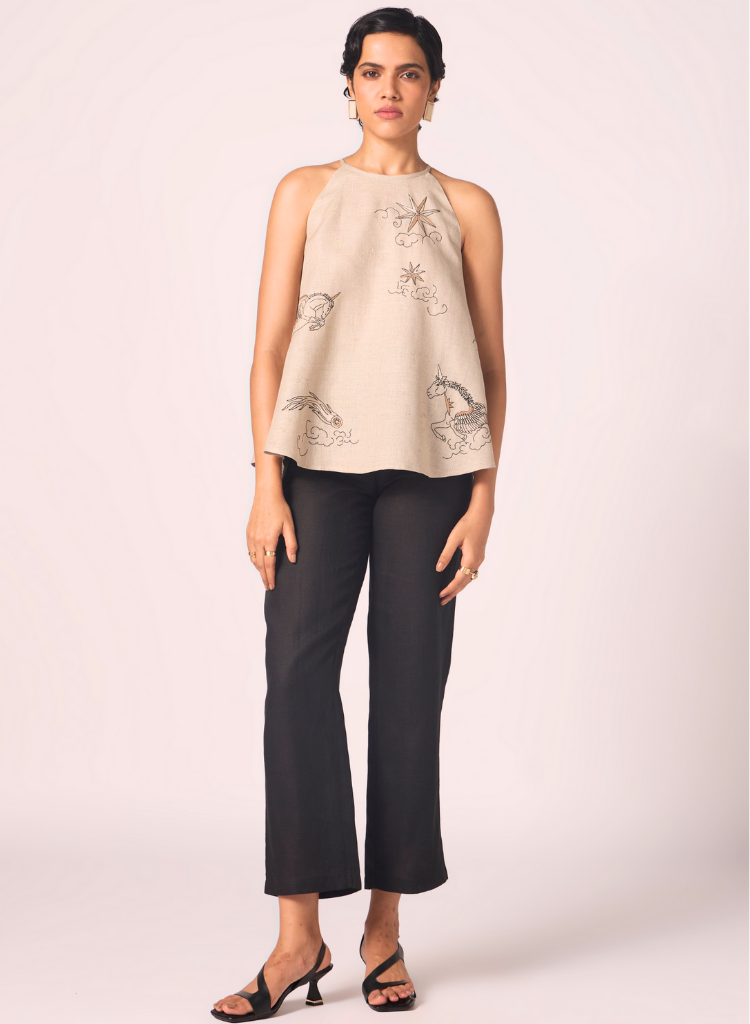 A sleeveless top featuring a halter neck and rouleau button at back. The model 5'8 and wearing a size S.