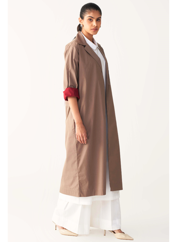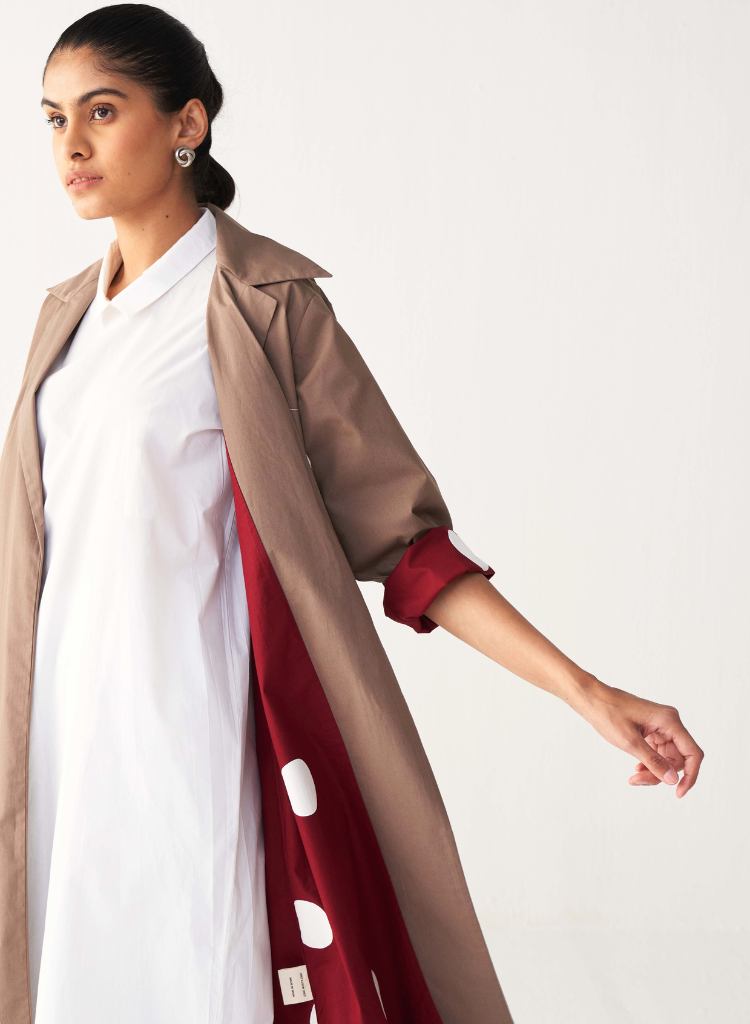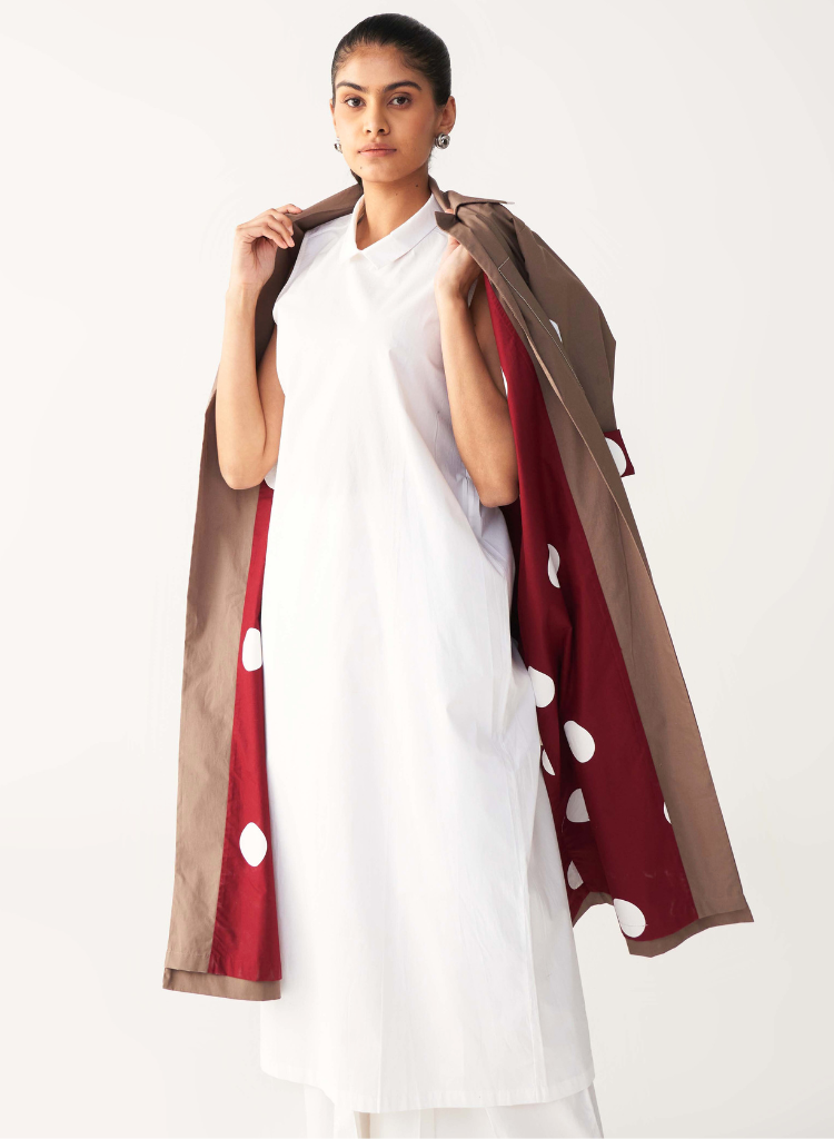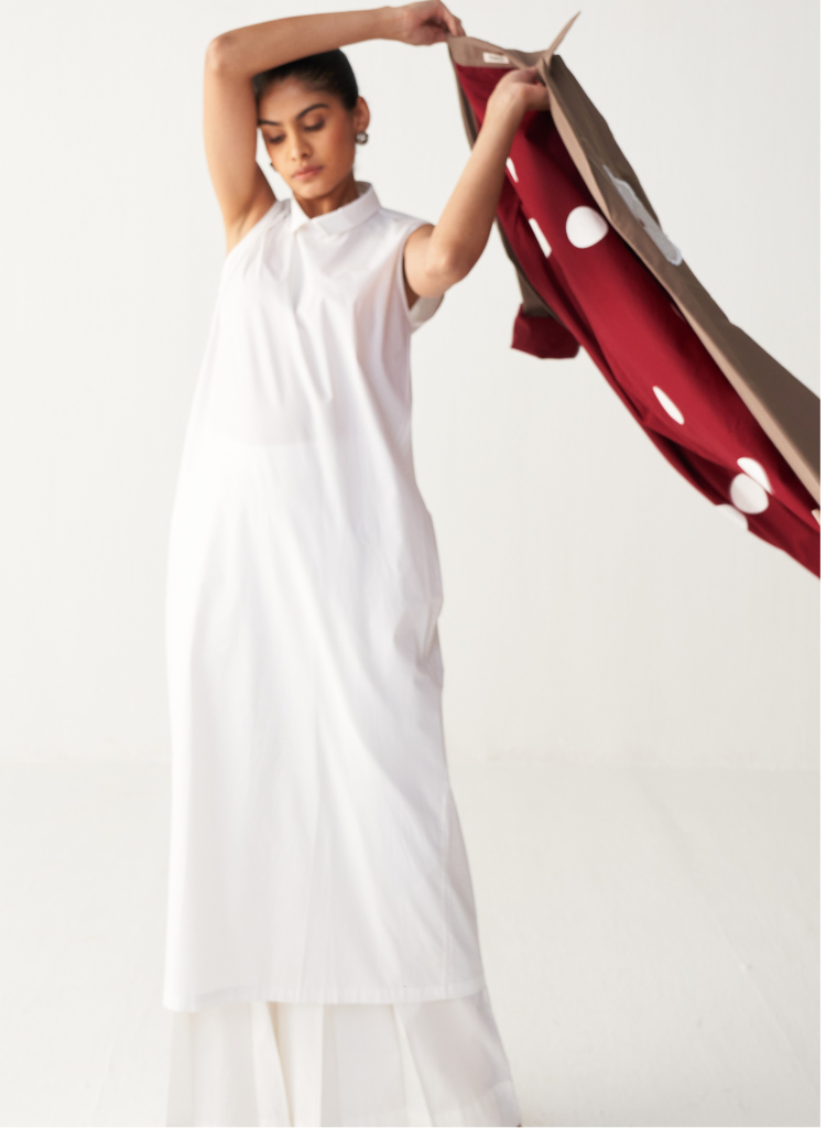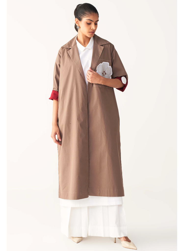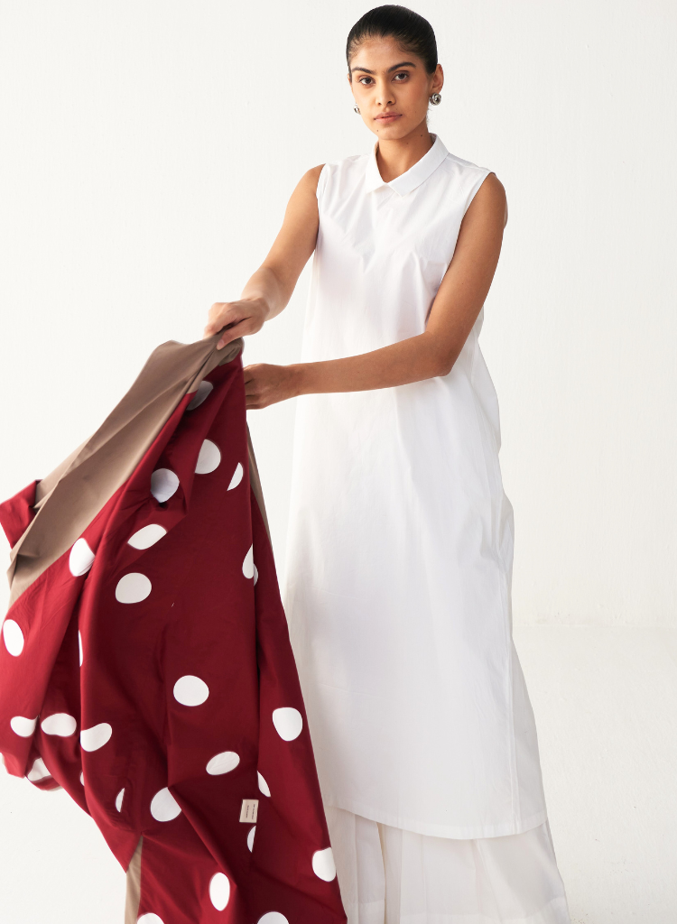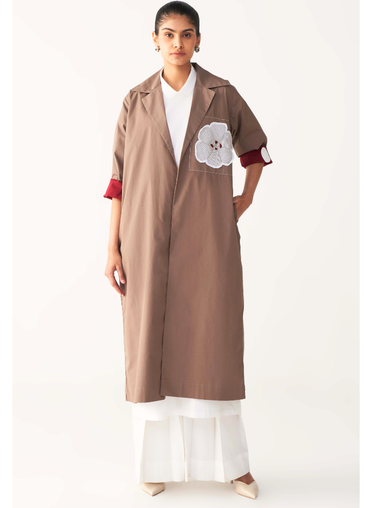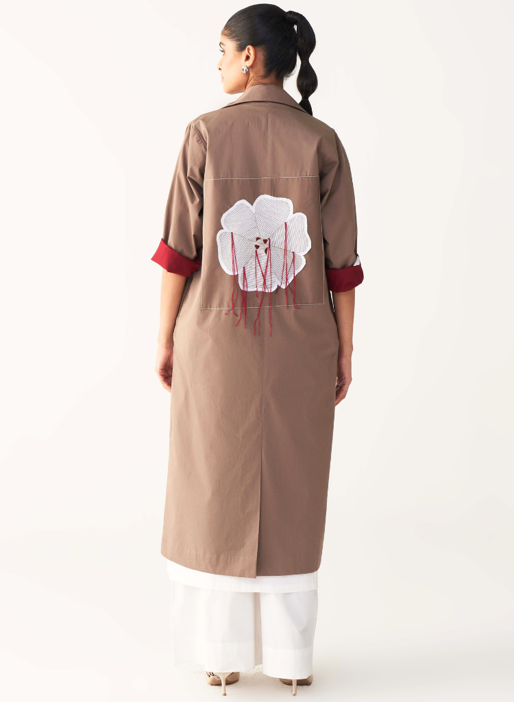 A three-piece set pairing the Floral Appliqué Fringe Jacket, a collared tunic and the Inverted Box Pleat Bottoms. A relaxed fitting jacket with floral appliqué detail featuring a lapel collar and inseam pockets. Lined with polka. Length 48". The collared tunic features a concealed placket and side slits. The pants feature an elasticated waist and inseam pockets. The solid broad pants with inverted box pleat details feature a fitted waist and inseam pockets. Length 40". Made in cotton poplin.