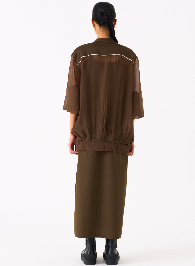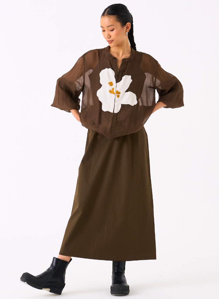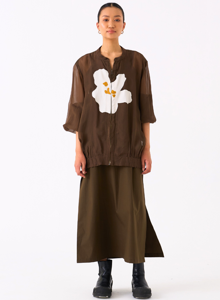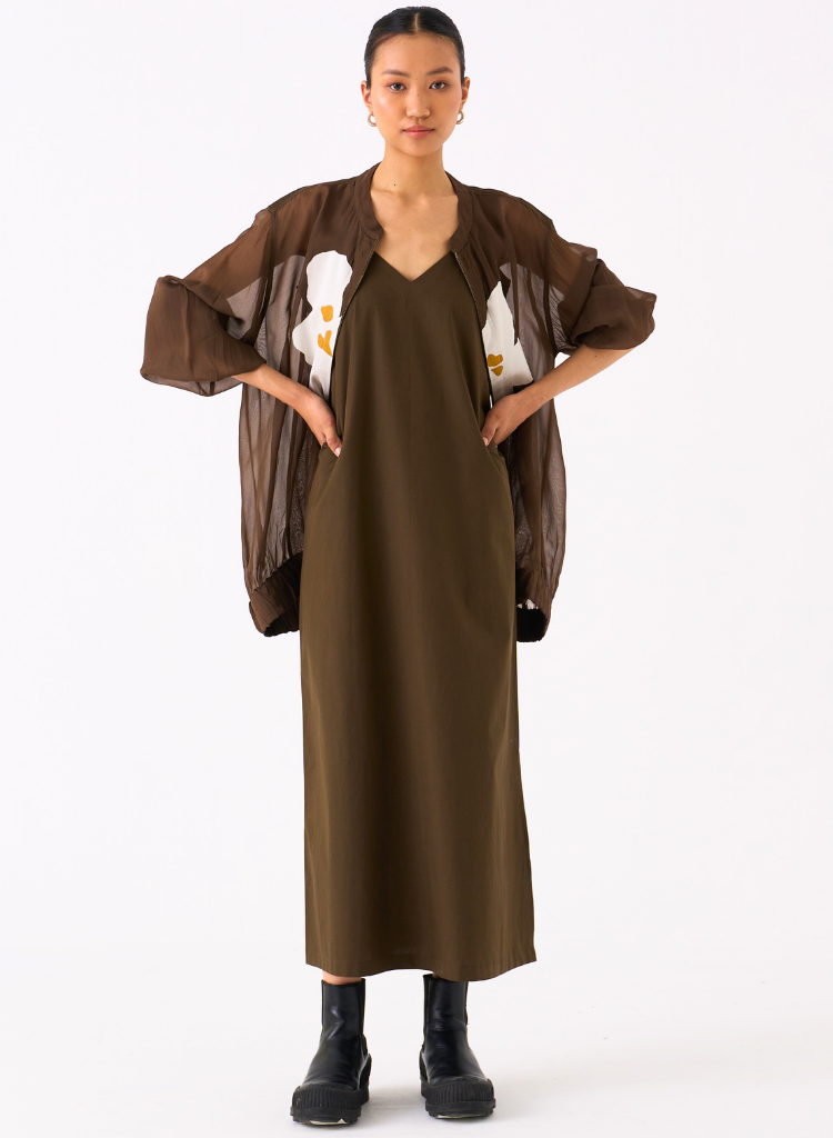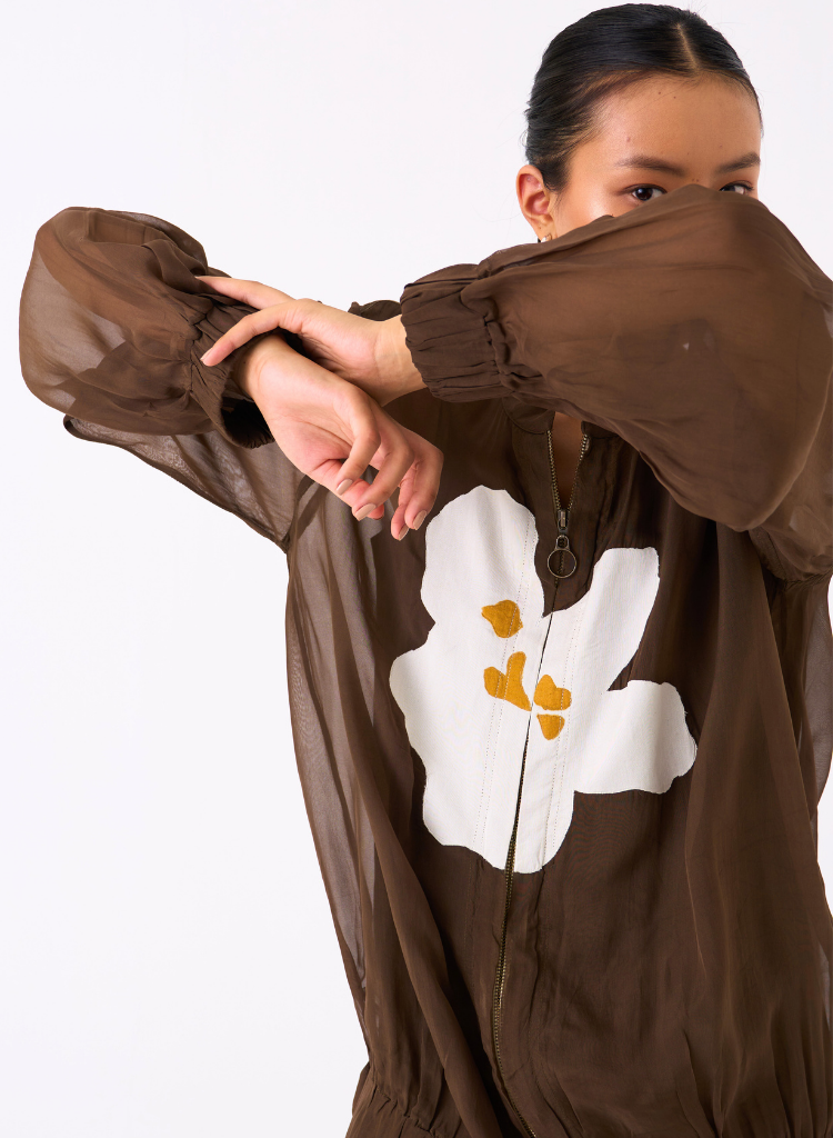 A two piece set pairing the Floral Bomber Jacket and a slip dress. The long sleeve bomber jacket with a floral appliqué detail features a front open zipper and a elasticated sleeves and hem. Length 24". Made in Organza. The slip dress features a V-neck. Length 50". Made in cotton poplin.