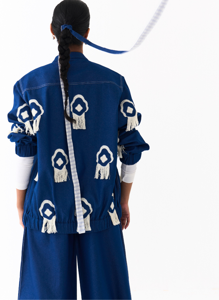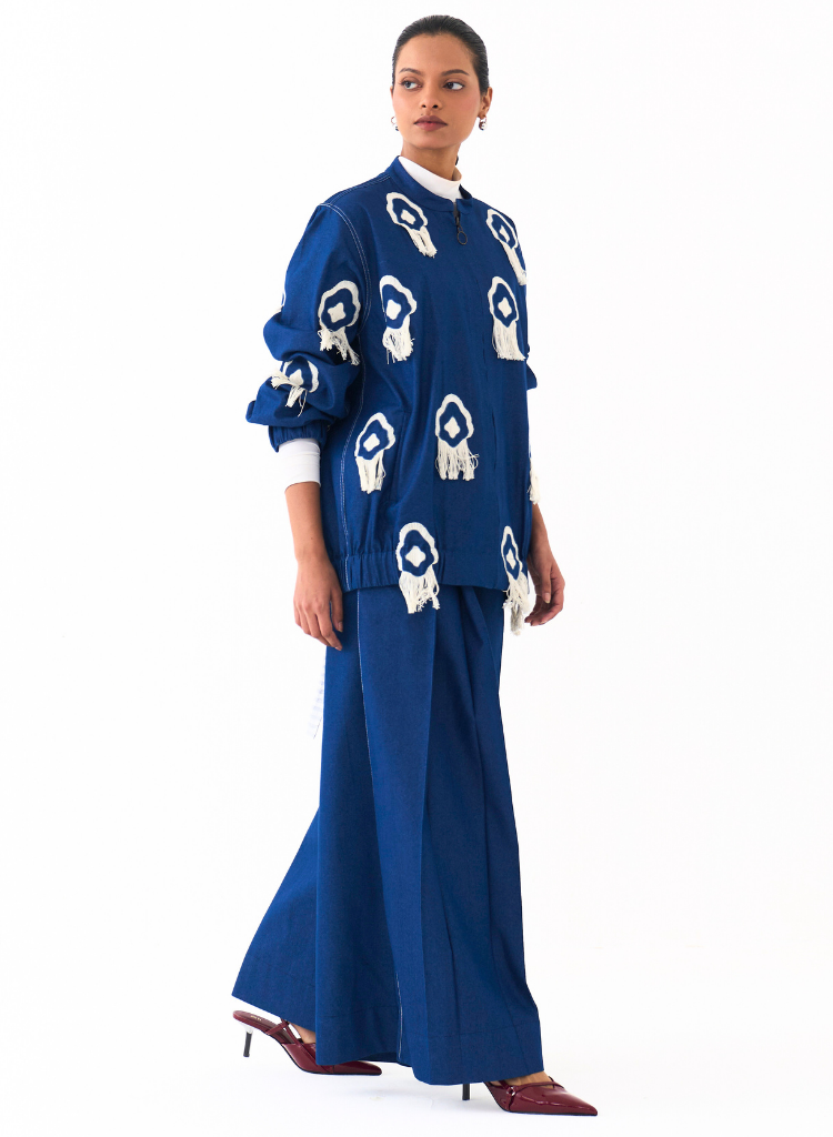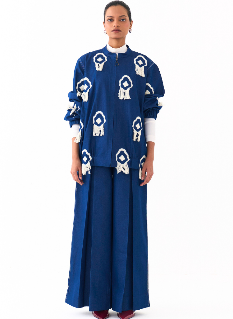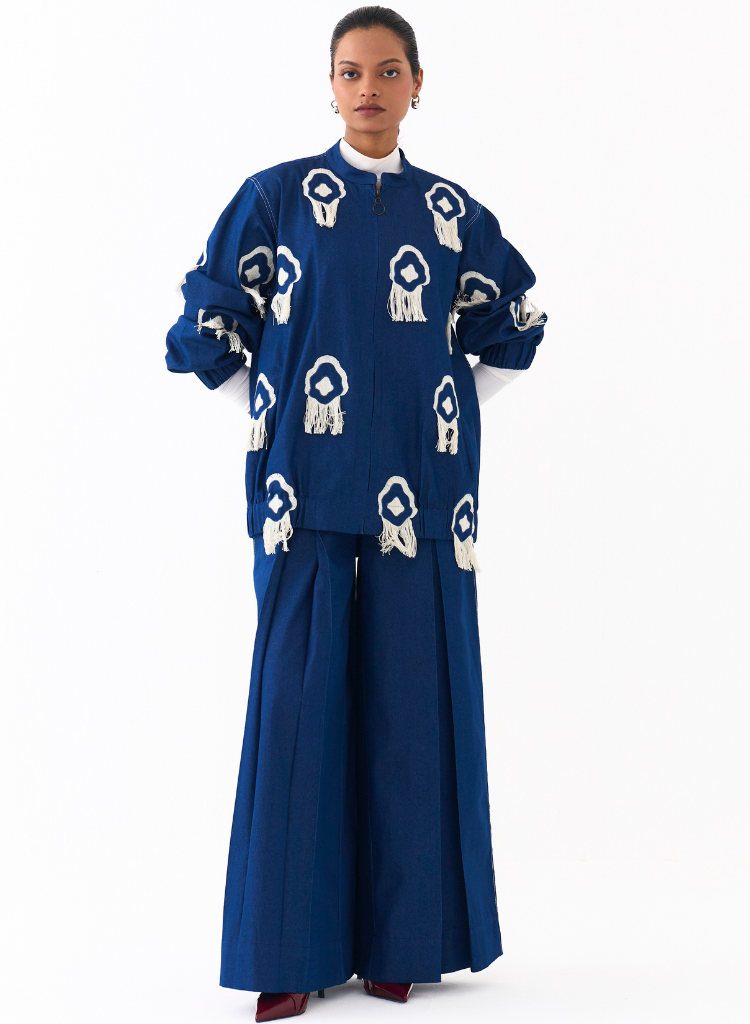 A two-piece set pairing the Fringe Bomber and the Inverted Box Pleat Bottoms. The bomber jacket with fringe embroidery detail features a front open zipper and side pockets. Length 28.5". The broad pants with inverted box pleat details and high side slits with buttoned closure feature a fitted waist and inseam pockets. Length 41". Made in Denim.