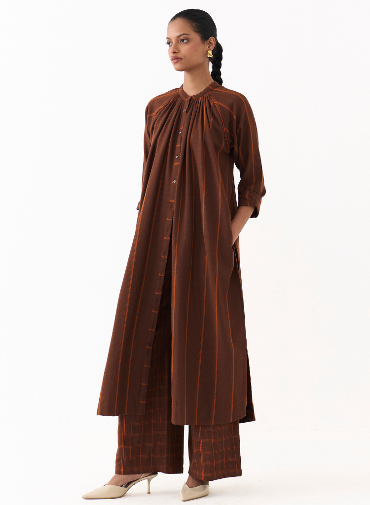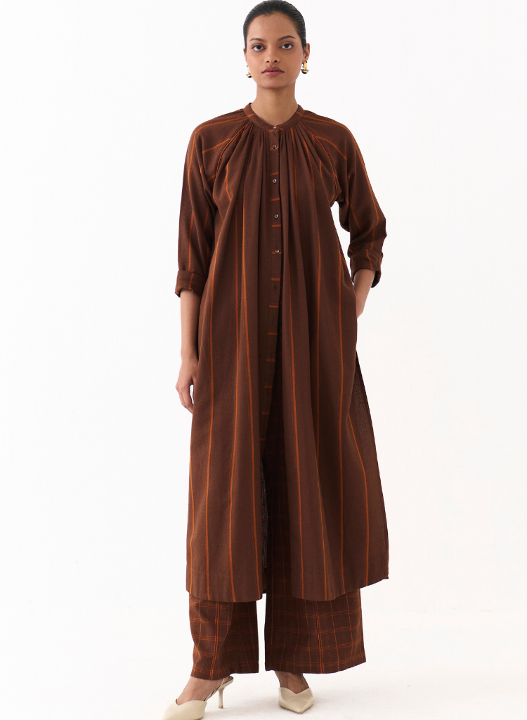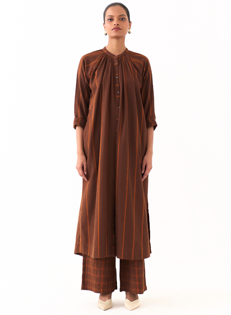A two-piece set pairing the Gather Neck Shirt and matching bottoms. Gather Neck Shirt in stripes feature high slits and a concealed front button placket. Length 48". The high-waisted pants with contrast linear embroidery feature inseam pockets and an elasticated waist. Length 40". The model is 5'7" & is wearing size S.