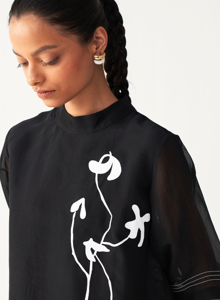 A two-piece set pairing the Poppy Top and the Wide Leg Broad Bottoms. The relaxed-fitting top with a poppy print detail features a high round neck and a back closure. Length 22". Made in Organza. The high-waisted wide-leg pants with embroidery detail at the bottom feature side pockets and a fitted waist. Length 40".