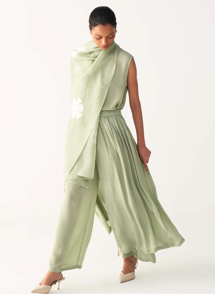 A three-piece set pairing the Floral Appliqué Scarf, Round Neck Top and the Skirt Pants. The top has a regular fit, a round neck and linear embroidery on the front. Full length 20". The bottom has a straight pant inside with a pleated top layer. Has side pockets and an elasticated back. Skirt length 36", Pant length 38". Made in silk crepe. The scarf features a floral appliqué detail. Dimensions 85" x 30". Made in Organza.