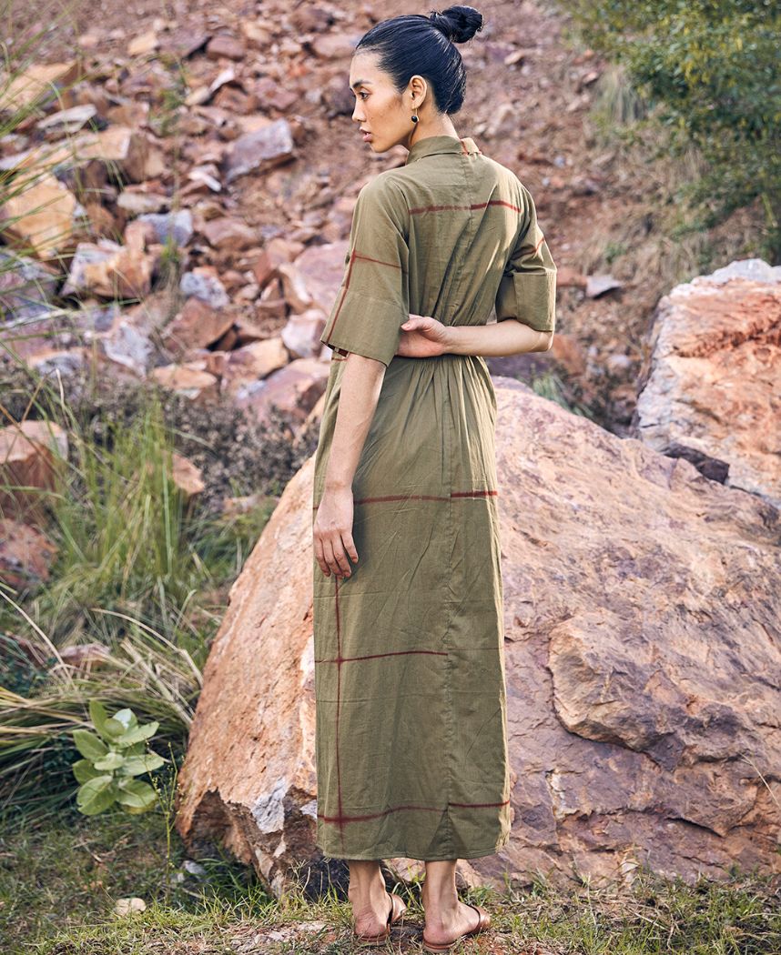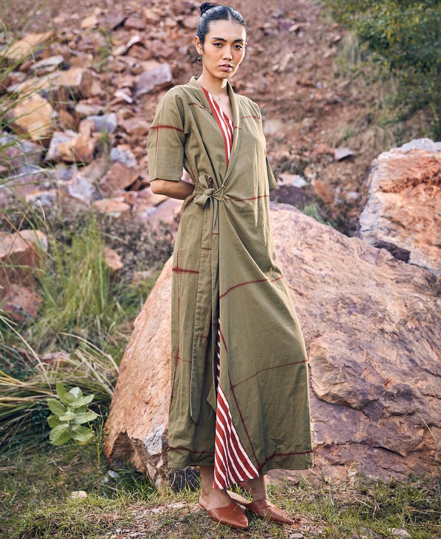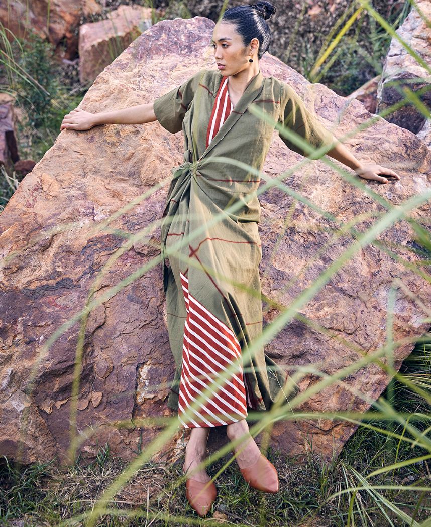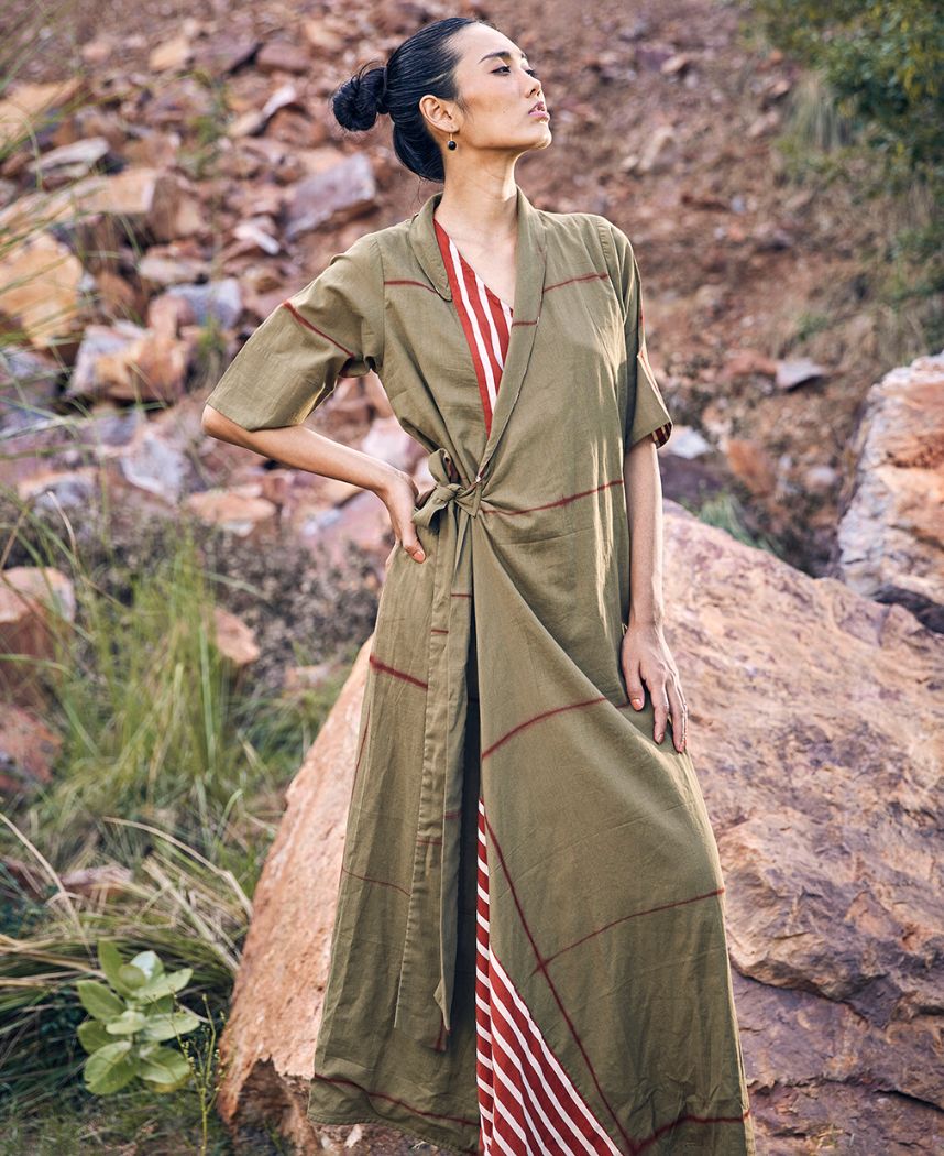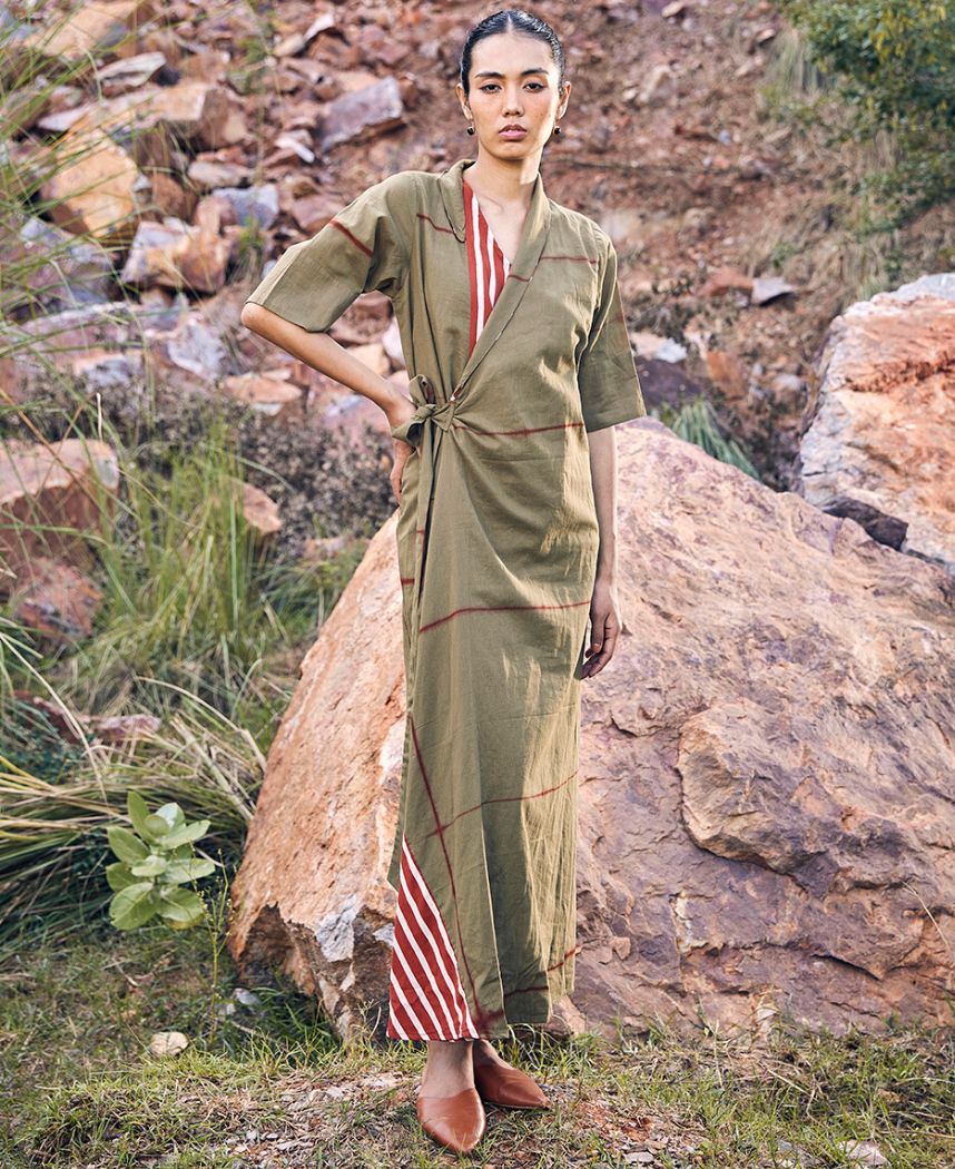 A tie dye wrap dress with striped detailing featuring a long shawl collar, front tie-up and an elasticated back. Length 54".