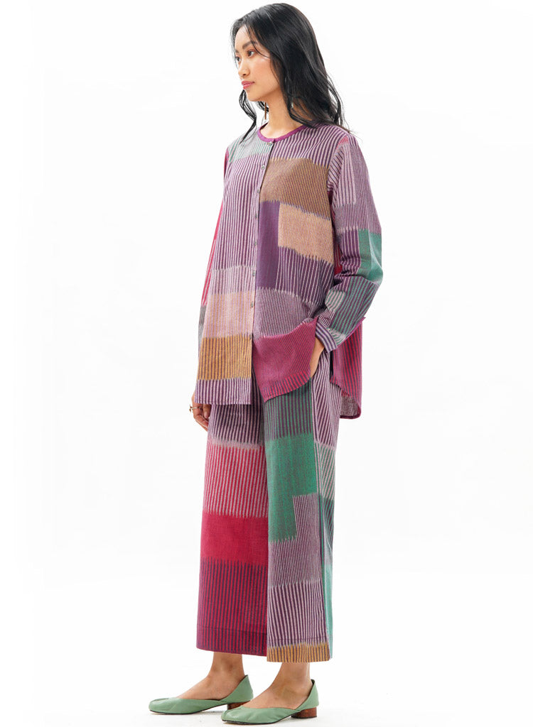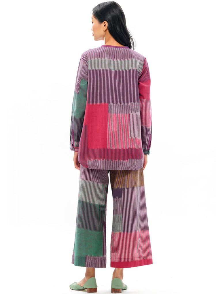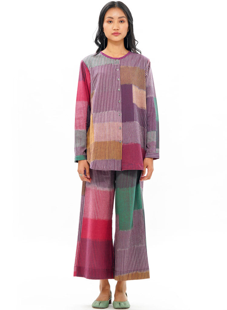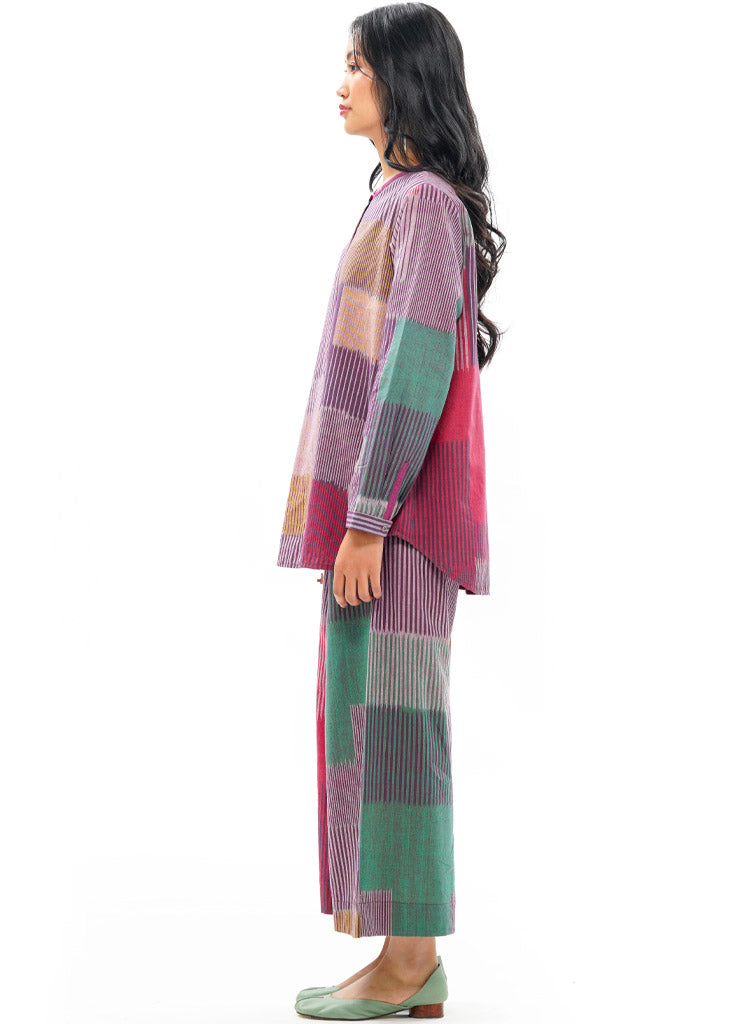 A two-piece set pairing the Fuji Classic Shirt and the Fuji Palazzo. The classic shirt features a round neck with a front button opening, long sleeves with cuffs and side slits. The cropped palazzo with an adjustable drawstring and an elasticated back waist belt feature side pockets. Length 35"- 37.5".